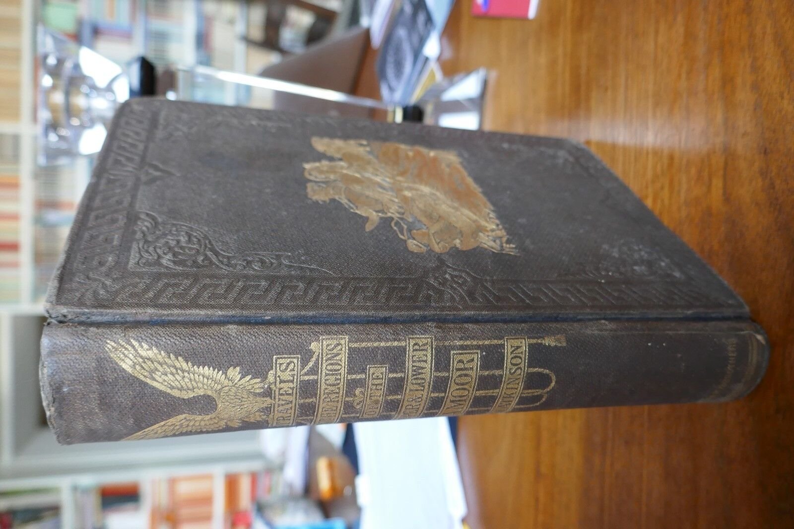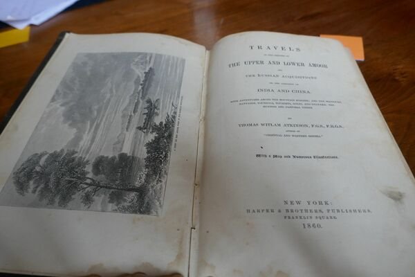 First US edition in VG condition, full brown original cloth with gilt lettering and design to front cover, slight shelfwear, large folding map perfect, some foxing, not affecting illustrations, 448 pages plus 4 pages of ads. original title: Travels in the regions of the Upper and Lower Amoor and the Russian acquisitions on the confines of India and China. With adventures among the mountain Kirghis; and the Manjours, Manyargs, Toungouz, Touzemtz, Goldi, and Gelyaks: the hunting and pastoral Tribes. , architect and traveller, Thomas Witlam Atkinson (1799 - 1861) and his wife Lucy, spent seven years travelling in Siberia and Central Asia during the period 1847 - 53. Their son Alatau was born during their travels at the beginning of November in 1848 in what is today Eastern Kazakhstan. Bearing in mind the conditions they were living in and the extreme cold, it is a miracle that he survived! Thomas Atkinson's first book "Oriental and Western Siberia: A Narrative of Seven Years' Explorations and Adventures in Siberia, Mongolia, The Kirghis Steppes, Chinese Tartary, and Part of Central Asia" was first published in London and New York in 1858. In the preface to this, his second book describing the travels he (and his wife and son who are invisible in his writing) gives more detail on the natural history and resources of this vast region than he gave in "Oriental and Western Siberia.". He did not confine himself to seeking only to satisfy the scientists among his readership but also discusses the possibility of British commerce in the region. "Our commerce, prodigious as are its operations, is, its is well known, capable of infinite expansion, and I have laid open a field of almost incalculable extent, where enterprise, skill, and industry are sure to find a profitable investment." He also addresses the great interest in Britain in Russian ambitions for the region: "For those of my compatriots who have been alarmed by the approaches of Russia to our Indian Empire, I have faithfully stated every step that has recently been made in this direction, and afforded them an opportunity of learning her present position on the north of the Himalaya. Her existing relations with China, now that we are engaged in a war with its government, will doubtless give increased interest to the facts I have been enabled to collect respecting the several advances she has skillfully made into Chinese territory, and the consequent extraordinary development of her own." (From the preface).