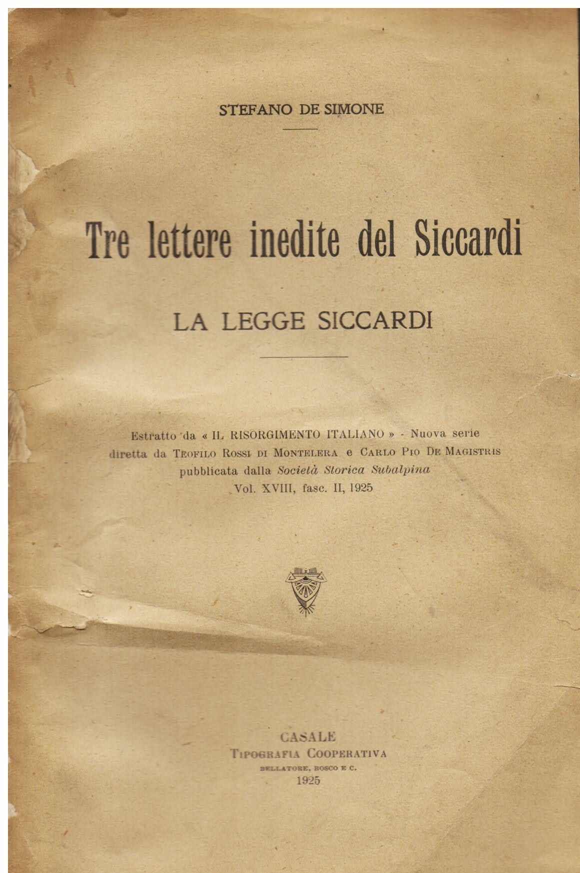 Tre lettere inedite del Siccardi. La legge Siccardi. Estratto da 'Il Risorgimento Italiano' Nuova serie diretta da Teofilo Rossi di Montelera e Carlo Pio De Magistris pubblicata dalla Società Storica Subalpina vol. XVIII, fasc. II, 1925