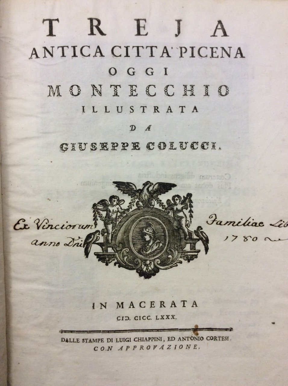 In-8 gr. (mm. 270x198), mz. pelle con angoli coeva, pp.XVI,238, con una bella veduta della città, più volte ripiegata, incisa in rame. Segue (con una strana numerazione delle pagine) una Appendice diplomatica cronologica: da pp. 49 a 88, da XLI a CXXXII, quindi lIndice dell'Appendice, pp. (2),XXII (inclusa l'Errata); ornata da testatine, grandi iniziali e finali xilografati. "Edizione originale". Cfr. Lozzi,II,5556. Il fermiano Giuseppe Colucci (1752-1809), ordinato sacerdote nel 1775, si dedicò a ricerche di carattere storico-archeologico, estendendo il raggio di interesse a tutto il Piceno; ottenne lusinghieri apprezzamenti da parte di letterati oltre che la protezione di influenti membri della Curia romana. Così Diz. Biografico Italiani,XXVII, p.499/500.Esemplare ben conservato.