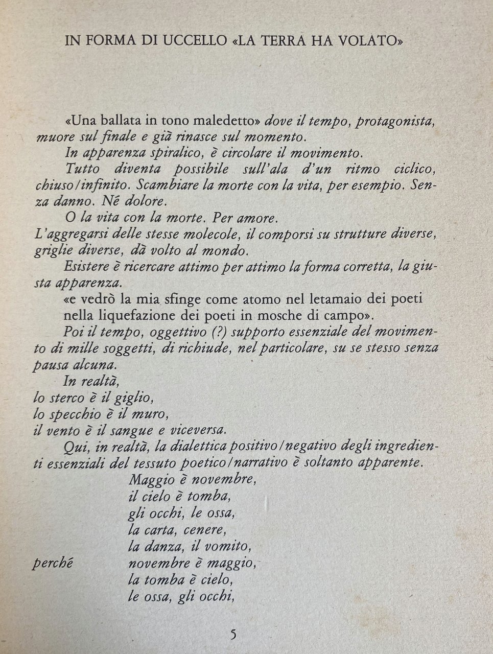 Fiore, come fosse un cronista, un daimon che sta nell'orecchio di quell'uomo a cui capitò la ventura (sventura?) di ritrovarsi nel Tempo, riporta in versi-note da telegrafo lo «stupore dell'essere vivo / stop / carnale / stop / alla ricerca dell'oggetto». Quest'individuo non può fare a meno di andare, appunto, «alla ricerca dell'oggetto», di prescindere, cioè, dalla sua individualità, dal soggetto: è una tensione atavica, che custodisce dentro. Anche per Fiore è così: nella sua opera l'io che in poesia tradizionalmente racconta le sue vicende, perlopiù liricamente, si avvilisce fino a scomparire: Fiore squarcia la tela dell'io e resta in attesa che il mondo con i suoi giochi carnali e preternaturali si palesi. Non è Elmerindo che osserva, ma è il suo puro pensiero, o meglio, uno specchio metafisico, incastonato tra l'aorta e il ventricolo destro: «Sotto i passi la terra si restringe / la rapirò con lo specchio».