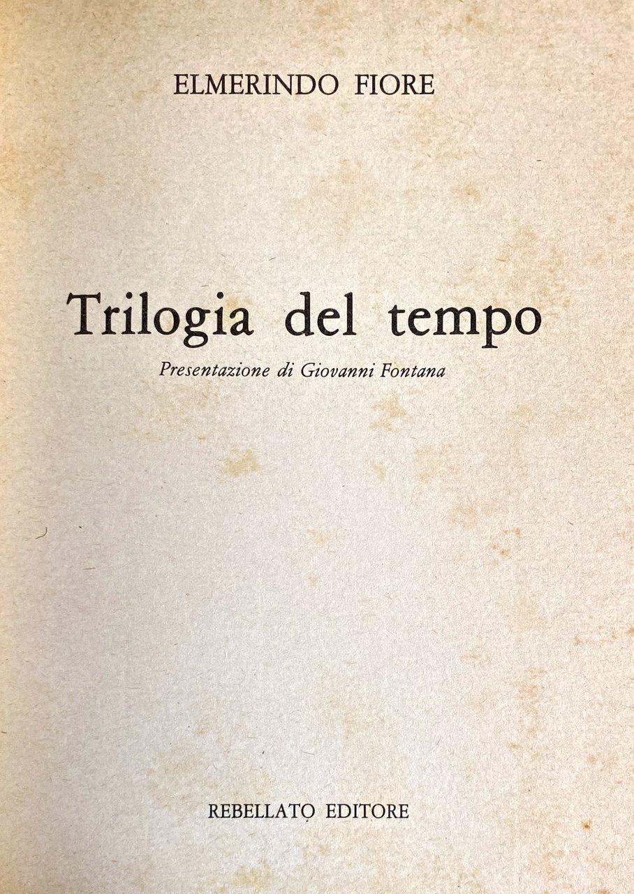 Trilogia del Tempo di Elmerindo Fiore somiglia a una grande cattedrale con gli archi rampanti, i pinnacoli, gli archi di scarico, le vetrate. Galleggia sul vuoto come la Notre Dame dell'Île de la Cité. Vi somiglia per tinte, atmosfere e per aspirazione all'assoluto. Scritta agli inizi degli anni Settanta, Trilogia del Tempo presenta già, in nuce, tutti i caratteri ricorrenti delle opere di Fiore e i nuclei proble-mate-matici sui quali si interroga, con quella cura amorevole verso l'esistenza che è propria di ogni poeta. Se ti affacci dalla balconata con balaustra, ti coglie una vertigine, sebbene ci sia tutta quella oscurità in fondo, morbida come ovatta. Trilogia del Tempo non è certamente un'opera di intrattenimento, né una lettura lieve; è un'esperienza misticheggiante che va alle radici dell'esistenza, tentando di percorrere le strade (tre!) del Tempo. Il libro, prefato da Giovanni Fontana, teorizzatore della poesia pre-testuale (poesia che precede le lingue e si esprime attraverso i più disparati linguaggi), si articola, infatti, in tre parti: Frammenti per un'ipotesi sulla nascita del tempo, L'acqua il fuoco e una ballata in tono maledetto, Frammenti per un'ipotesi sulla morte del tempo.