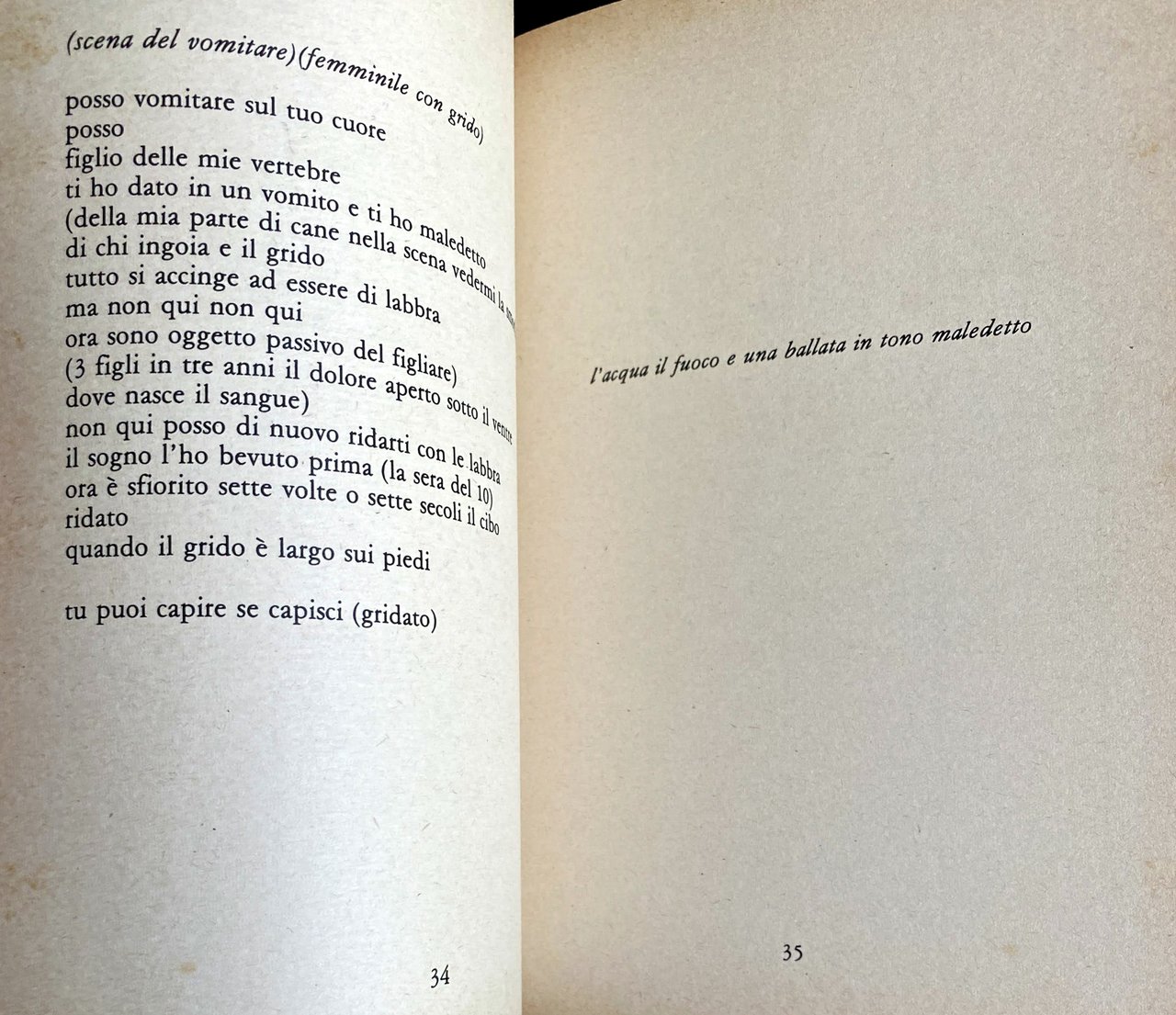 Nell'opera di Fiore è imprescindibile il confronto con l'arte visiva, dato il suo impegno di performer e la sua grande, grandissima capacità di creare immagini, altari di divinazione, affastellati, accatastati sulla pagina, in una smania demoniaca di conoscenza, in un horror vacui. Ma la più bella delle scene di questa sezione è quella “del vomitare, femminile con grido”: «Posso vomitare sul tuo cuore / posso / figlio delle mie vertebre / ti ho dato in un vomito e ti ho maledetto». Vomitare deriva dal latino vomere, che significa eruttare, emettere: proprio questo è il significato della scena, che è la rappresentazione di un parto, «quando il grido è largo sui piedi»: dolcezza e strazio si mescolano a creare un sapore agrodolce che Fiore predilige.