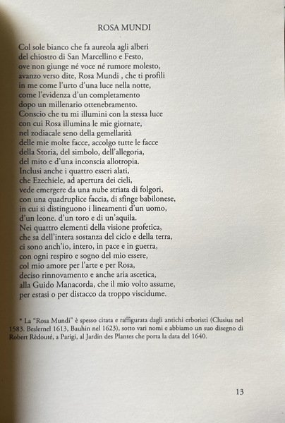 Soggetti: Poesia contemporanea, Poeti napoletani, Poetica, Versi, Amore, Poemi, Raccolte poetiche, Antologie, Romanticismo, Fiori, Simbolismo, Flaneur, Napoli esoterica, Viaggio, Sacro, Profano, Mistero, Religiosità, Renato Caccioppoli, Strade, Vicoli, Quartieri, Cultura partenopea, Monte di Dio, Egiziaca a Pizzofalcone, Baudelaire, Orto botanico, Vita, Libri fuori catalogo, Libri illustrati, Arte, Artisti, Cielo d'Alcamo, Il nome della Rosa, Umberto Eco, Stat rosa pristina nomine, nomina nuda tenemus, Dante, Centro storico Antico, Chiostri, Castelli, Musei, Librerie, Mostre, Teatri, Concerti, Chiostro di San Marcellino e Festo, Santa Maria Apparente, Mergellina, Coroglio, Posillipo, Lungomare, Rosa Mundi, Camaldoli, Vomero, Monteoliveto, San Biagio dei Librai, Musil, Giambattista Vico, Rilke, Elegie, Richiami intellettuali, Citazioni, Universo, Universalità, Croce, Contemporary poetry, Neapolitan poets, Poetics, Verses, Love, Poems, Poetic collections, Anthologies, Romanticism, Flowers, Symbolism, Esoteric Naples, Travel, Sacred, Profane, Mystery, Religion, Streets, Alleys, Neighborhoods, Neapolitan culture, Botanical garden, Life, Out of print books, Illustrated books, Art, Artists, Ancient historical center, Cloisters, Castles, Museums, Libraries, Exhibitions, Theaters, Concerts, Lungomare, Rosa Mundi, Elegies, Intellectual references, Quotes, Universe, Universality, Cross