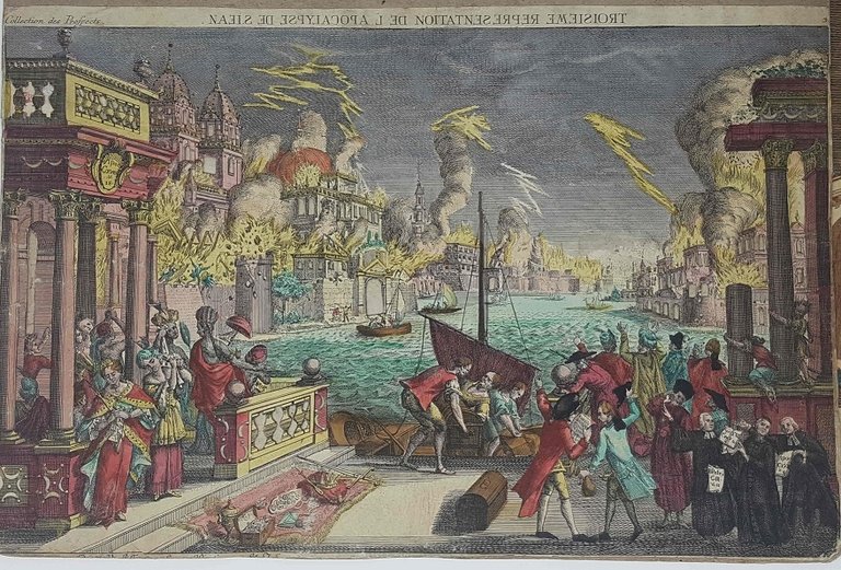 >Rara incisione originale (mm 282x393), "vue d'optique" 1750 ca., traforata ed abilmente colorata da mano coeva. Incisione controffondata con cartoncino coevo. Deliziosa veduta con finestre e contorni architettonici traforati che conferiscono all'incisione un doppio effetto giorno/notte, che rappresenta la caduta di Babilonia.