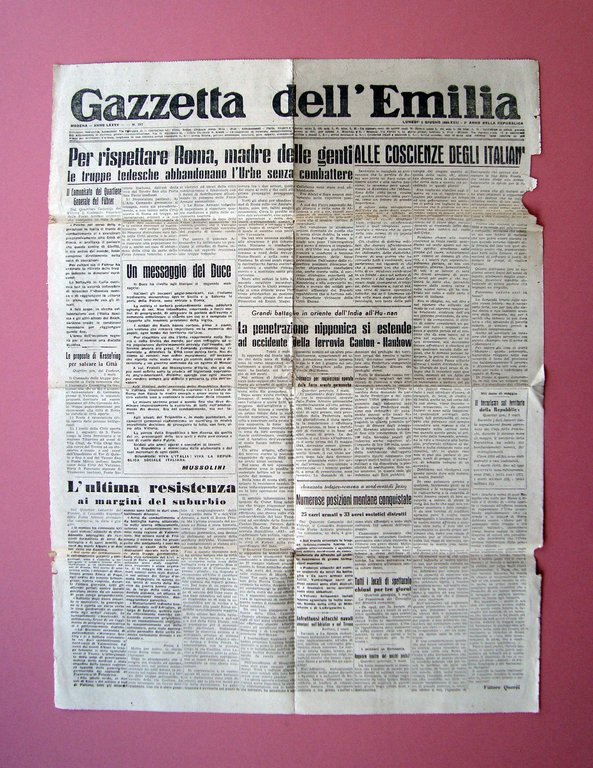 Periodico, Gazzetta dell'Emilia" Anno LXXXV Numero 217 5 Giugno 1944-XXII in prima "Per rispettare Roma, madre delle genti le truppe tedesche abbandonano l'Urbe senza combattere" Modena, 1944-XXII; cm 57x42, pp. 2 (una pagina fronte -retro). Numero completo. Condizioni di conservazione Esemplare in buone condizioni con tracce d'uso, pieghe di conservazione che si presentano con piccoli strappetti; margini con strappetti e qualche piccola mancanza; per le condizioni vedi foto. Numero completo. SC03.D16913 blu "