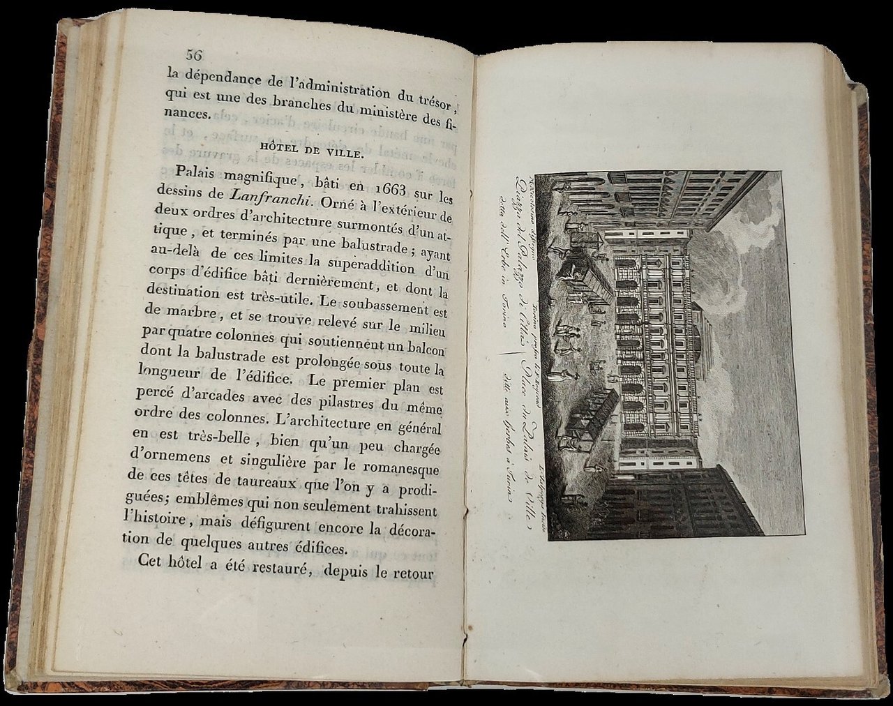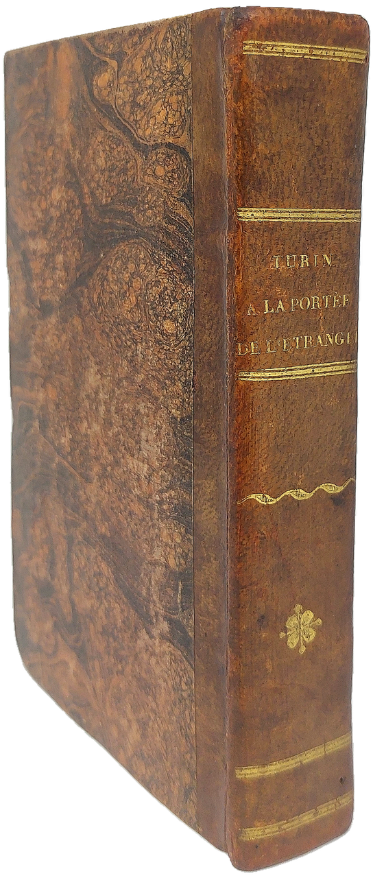 >in-16 (150x90 mm), pp. XVI, 352, legatura coeva in mezza pelle, titolo e fregi oro al dorso liscio, piatti in carta marmorizzata. Adorno di una grande pianta della città ripiega più volte e di 18 belle tavole di vedute fuori testo inc. in rame, 14 di piazze e luoghi artistici di Torino, e quattro di Moncalieri, Rivoli, Stupinigi e Racconigi. Prima edizione. Trattasi della prima guida ''moderna'' di Torino, assai importante e rara. Buon esemplare, fresco (lieve macchietta all'angolo infer di pp. 97-106) Peyrot, Torino nei secoli, 328. Cat. Collez. Simeon, G11. Bovolato, Archivio storico, p.310.