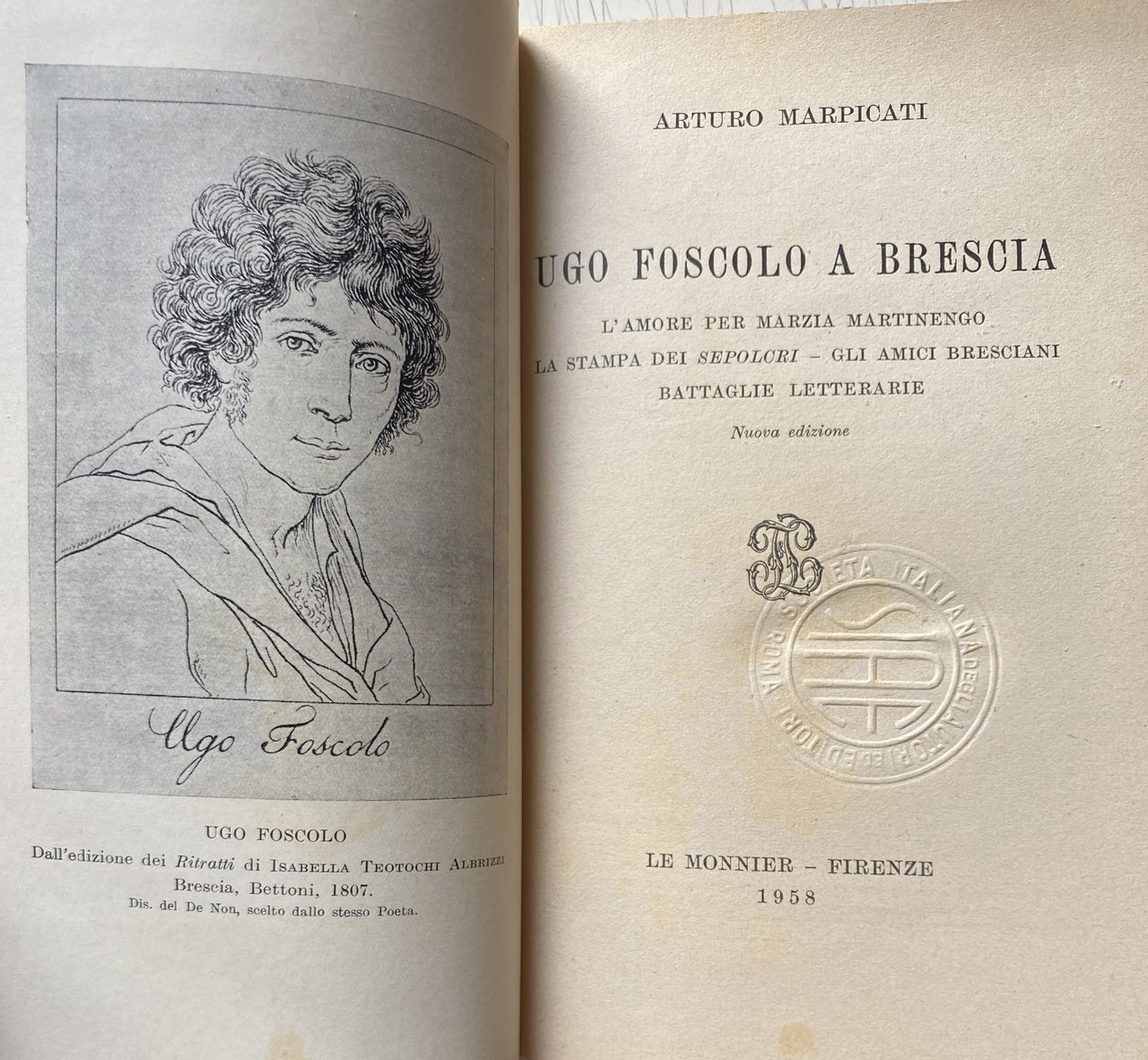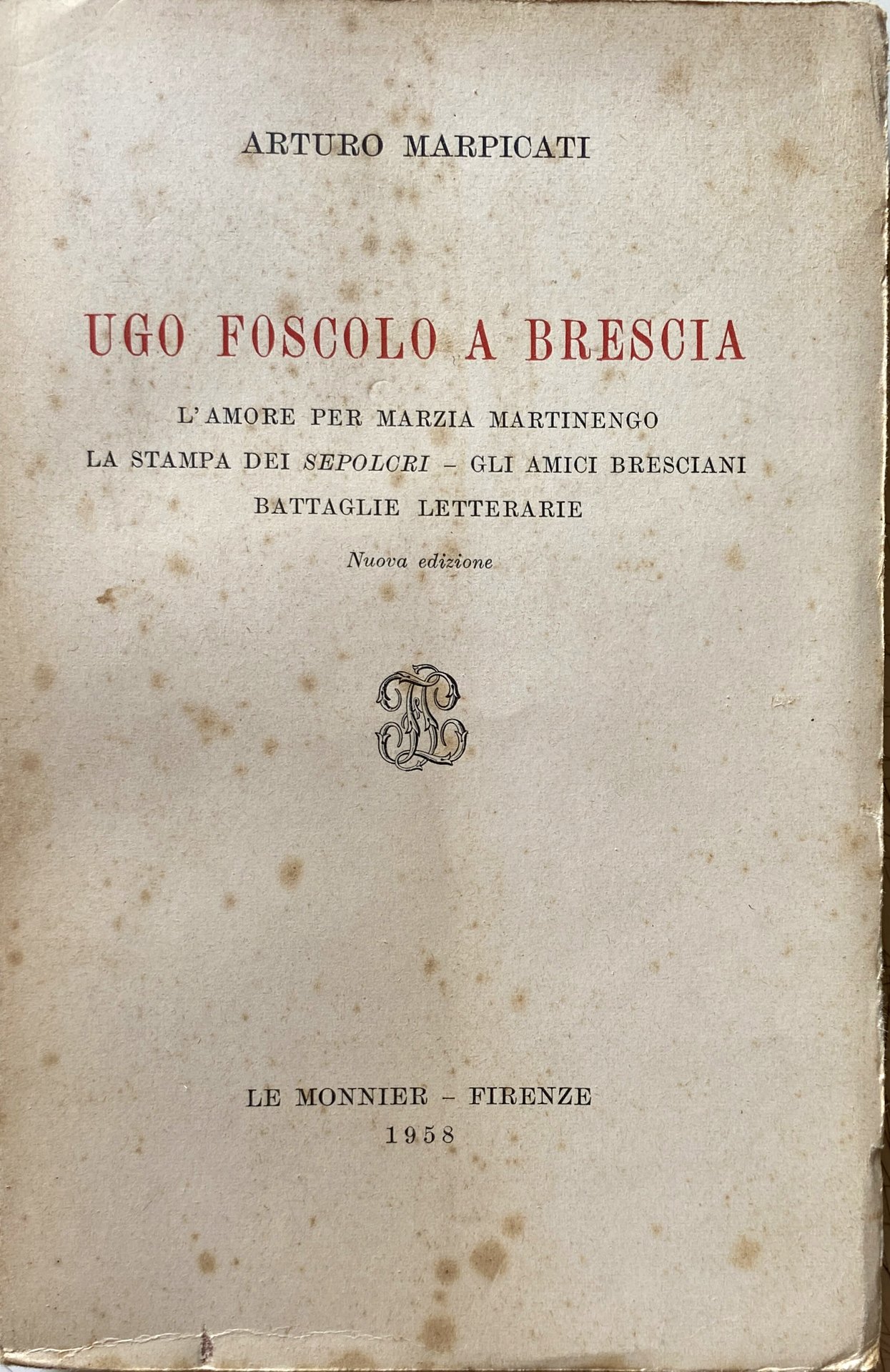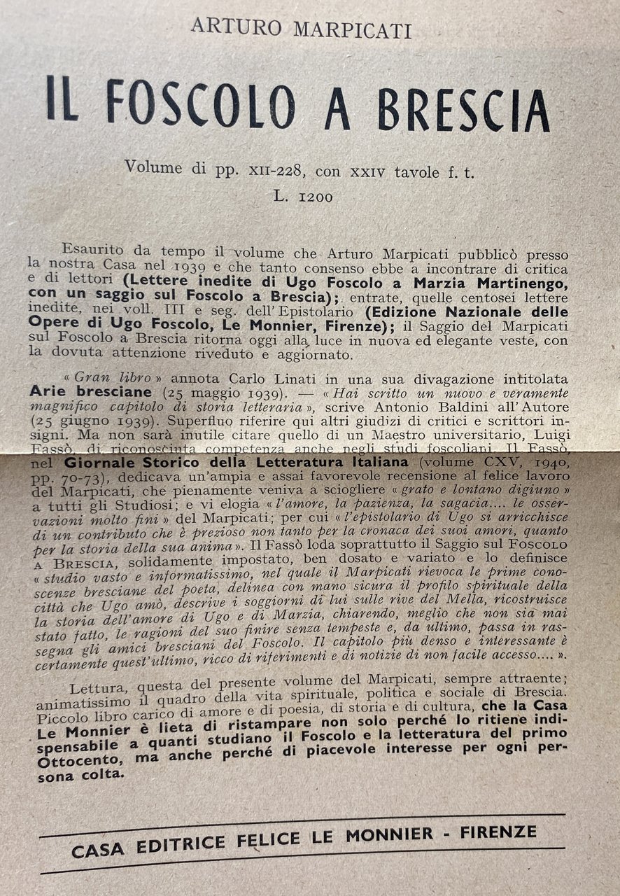 Il Fassò loda soprattutto il Saggio sul FOSCOLO A BRESCIA, solidamente impostato, ben dosato e variato e lo definisce «studio vasto e informatissimo, nel quale il Marpicati rievoca le prime conoscenze bresciane del poeta, delinea con mano sicura il profilo spirituale della città che Ugo amò, descrive i soggiorni di lui sulle rive del Mella, ricostruisce la storia dell'amore di Ugo e di Marzia, chiarendo, meglio che non sia mai stato fatto, le ragioni del suo finire senza tempeste e, da ultimo, passa in rassegna gli amici bresciani del Foscolo. Il capitolo più denso e interessante è certamente quest'ultimo, ricco di riferimenti e di notizie di non facile accesso.». Lettura, questa del presente volume del Marpicati, sempre attraente; animatissimo il quadro della vita spirituale, politica e sociale di Brescia. Piccolo libro carico di amore e di poesia, di storia e di cultura, che la Casa Le Monnier è lieta di ristampare non solo perché lo ritiene indispensabile a quanti studiano il Foscolo e la letteratura del primo Ottocento, ma anche perché di piacevole interesse per ogni persona colta.