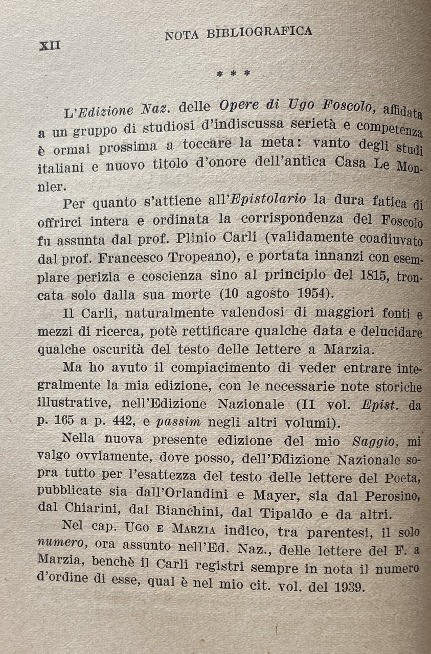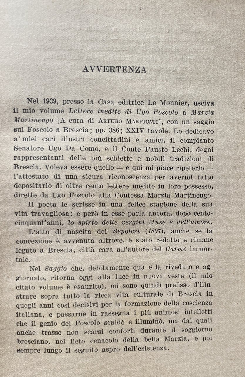 Esaurito da tempo il volume che Arturo Marpicati pubblicò presso la nostra Casa nel 1939 e che tanto consenso ebbe a incontrare di critica e di lettori (Lettere inedite di Ugo Foscolo a Marzia Martinengo, con un saggio sul Foscolo a Brescia); entrate, quelle centosei lettere inedite, nei voll. III e seg. dell' Epistolario (Edizione Nazionale delle Opere di Ugo Foscolo, Le Monnier, Firenze); il Saggio del Marpicati sul Foscolo a Brescia ritorna oggi alla luce in nuova ed elegante veste, con la dovuta attenzione riveduto e aggiornato. «Gran libro» annota Carlo Linati in una sua divagazione intitolata Arie bresciane (25 maggio 1939). «Hai scritto un nuovo e veramente magnifico capitolo di storia letteraria», scrive Antonio Baldini all' Autore (25 giugno 1939). Superfluo riferire qui altri giudizi di critici e scrittori insigni. Ma non sarà inutile citare quello di un Maestro universitario, Luigi Fassò di riconosciuta competenza anche negli studi foscoliani. Il Fasso nel Giornale Storico della Letteratura Italiana (volume CXV, 1940, PP. 70-73), dedicava un'ampia e assai favorevole recensione al felice lavoro del Marpicati, che pienamente veniva a sciogliere «grato e lontano digiuno» a tutti gli Studiosi; e vi elogia «l'amore, la pazienza, la sagacia, le osservazioni molto fini» del Marpicati; per cui «l'epistolario di Ugo si arricchisce di un contributo che è prezioso non tanto per la cronaca dei suoi amori, quanto per la storia della sua anima».