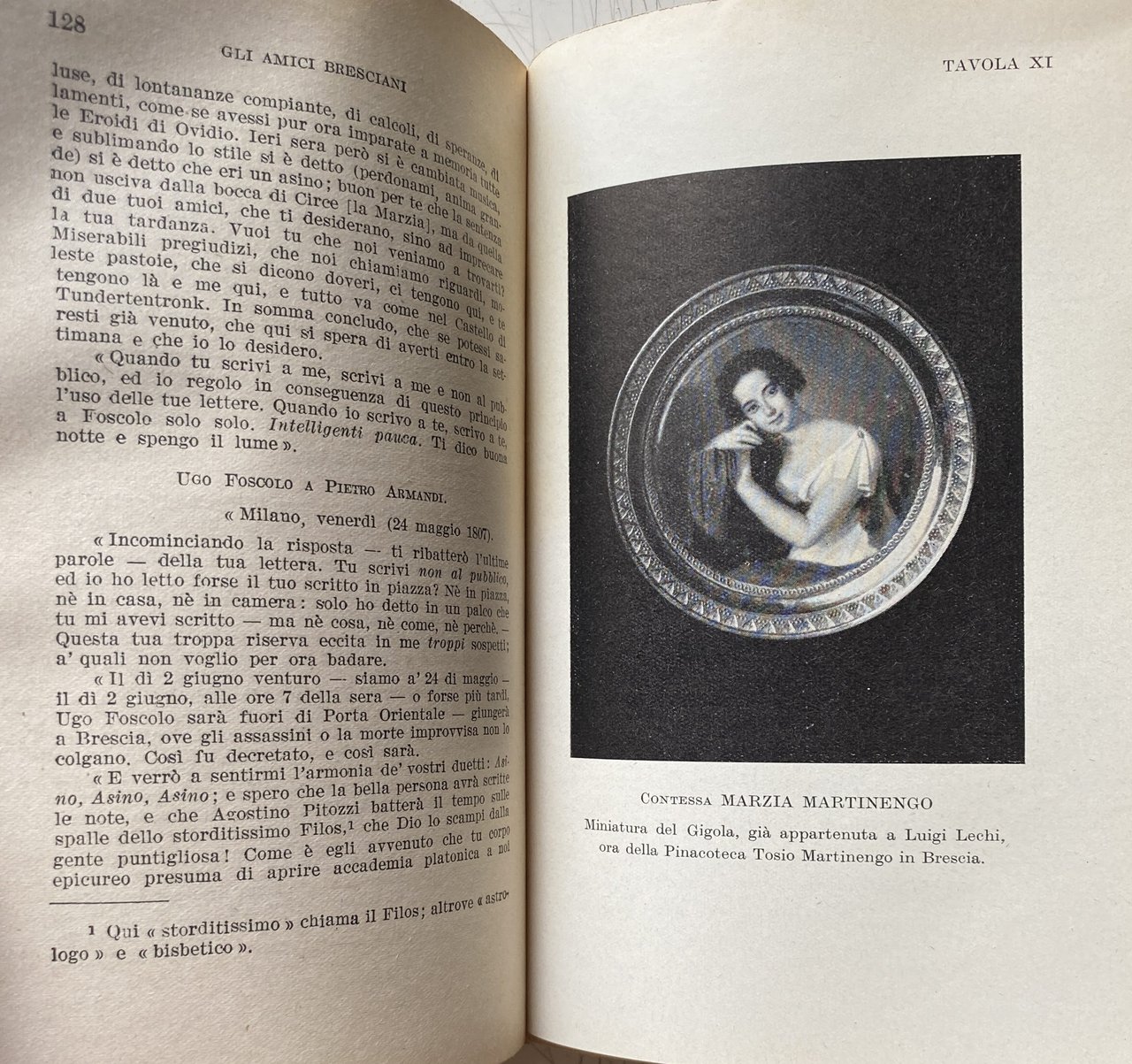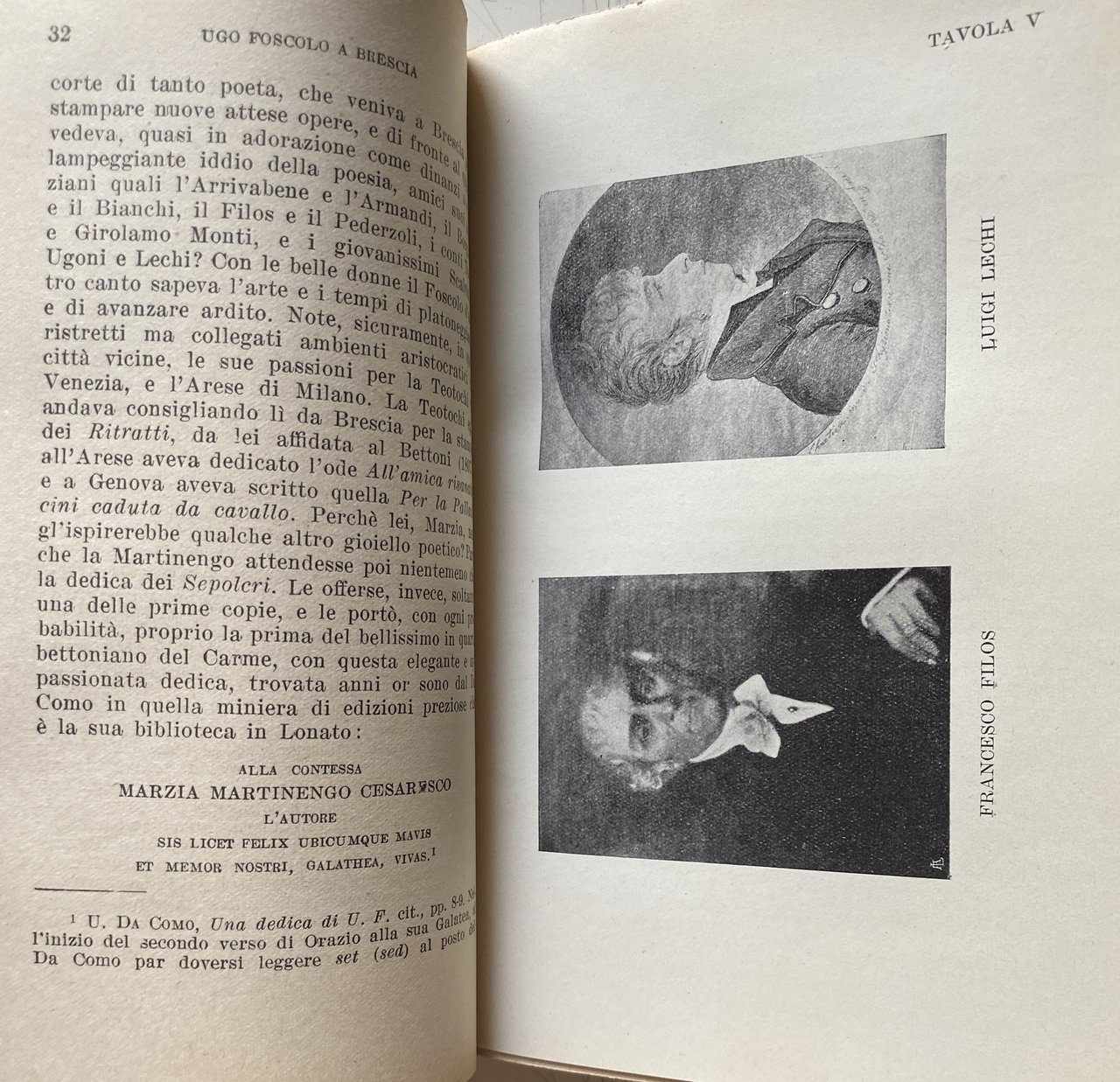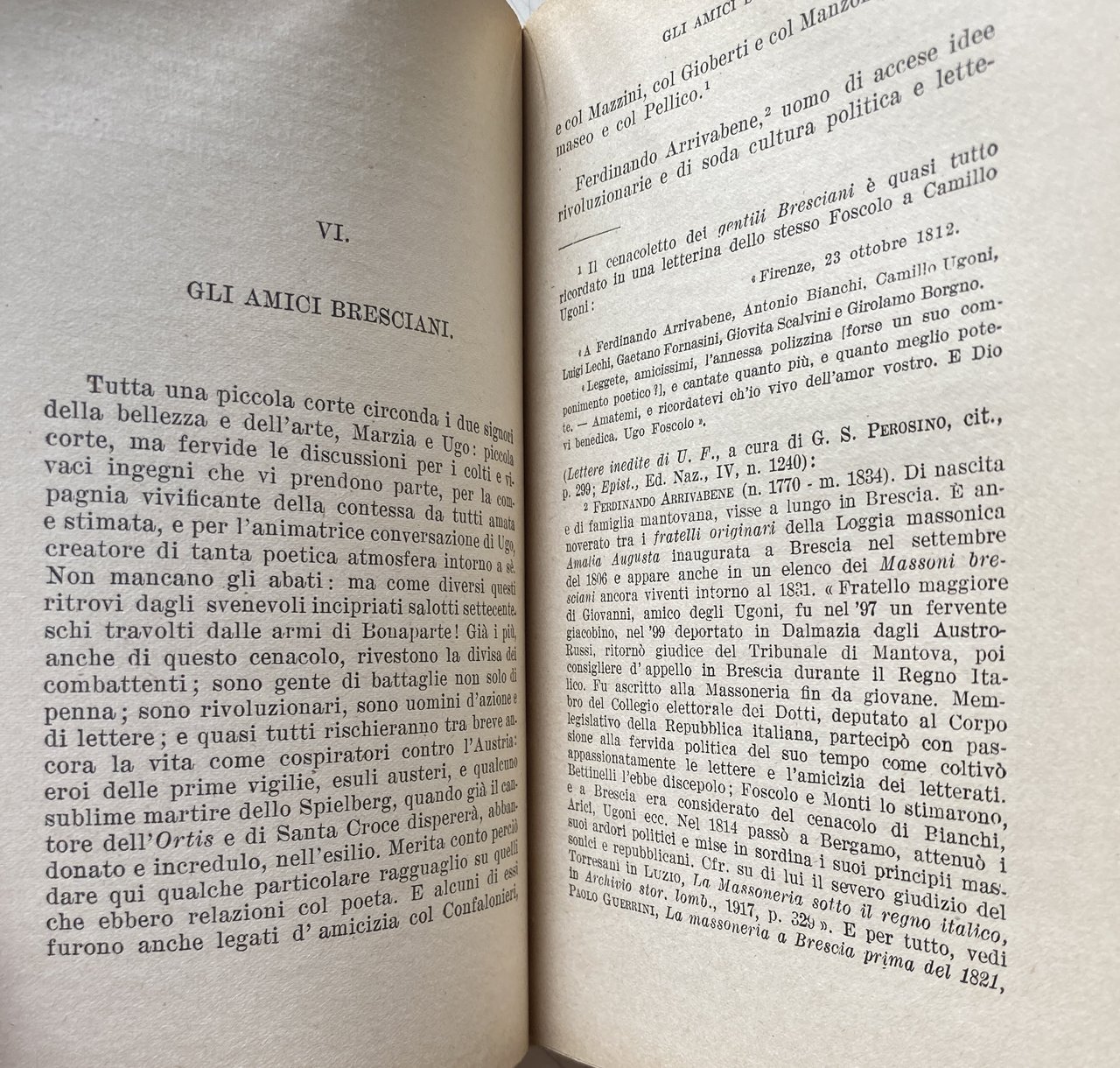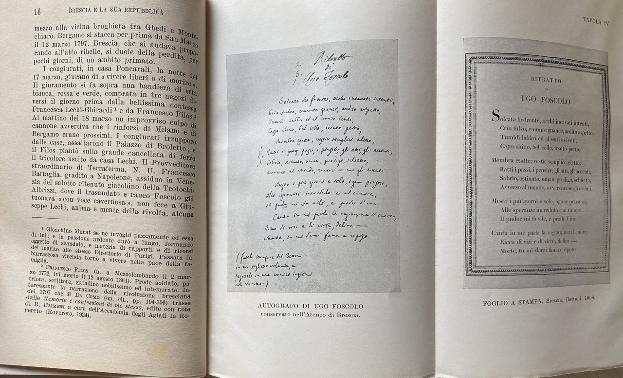 Soggetti: Letteratura italiana, Biografie, Memorie, Epistolario, Lettere inedite, Corrispondenza, Relazioni amorose, Scritti, Dediche, Scambi epistolari, Ugo Foscolo, Romanticismo, Poesia, Poesie, Storie d'amore, Intellettuali, Contessa Marzia Martinengo Cesaresco Provaglio, Amicizie, Intimità, Sepolcri, Critica letteraria, Epistofoscolario, Brescia, Nobildonne, Arnaldo Beltrami, Raccolte, Antologie, Collezionismo, Rarità librarie, Libri rari Vintage illustrati fuori catalogo, Antiquariato, Opere, Edizione Nazionale, Plinio Carli, Settecento, Ottocento, Venezia, Austria, Francia, Rivoluzione francese, Età Napoleonica, Trattato, Cessione, Vendita, Campoformio, Tradimenti, Tradimento, Impero austro-ungarico, Francia, Napoleone Bonaparte, Cisalpina, Carmi, Vita culturale, Isabella Teotochi Albrizzi, Amori, Gioventù, Salotti, Borghesia, Nobiltà bresciana, Eloquenza, Retorica, Esilio, Erudizione, Filologia, Traduzioni, Classicismo, Omero, Chioma di Berenice, Iliade, Marzaccan, Mario Fubini, Didimo Chierico, Odi, Frammenti, Poemi, Patriottismo, Nazionalismo, Silvio Pellico, Patrioti, Nicolò Bettoni, Tipografia, Stampa, Editoria, Stampatori, Bodoni, P. Barbera, Fornasini, Pasini, Almanacco del Mella, Vita bresciana, Anni giovanili, F. Barbieri, Giambattista Passano, Girolamo Federico Borgno, Camillo Ugoni, Francesco Filos, Pier Damiano Armandi, Latino, Greco, Ippolito Pindemonte, Vincenzo Monti, Cesare Arici, Gaetano Fornasini, Grecia, Zante, Giustina Renier Michel, Repubblica veneta, Luigi Scevola, Carlo Roncalli Parolino, Battaglie, Libertà, Bianca della Somaglia Uggeri, Fausto Lechi, Ugo Baroncelli, Paolo Tosio, Luigi Mabil, Ferdinando Arrivabene, Ugo Da Como, Jacopo Ortis, Annetta Arese Fagnani, Margherita Negroboni, Eleonora Monti, Lodovica Fè d'Ostiani, Conversazioni, Società salottiera, Politica, Indipendenza, Dame, Donne, Muse, Poetica, Passione, Saggistica, Riferimento, Consultazione, Bibliografia, Carteggio amoroso, Versi, Baretti, Chiarini, Arnaldo Beltrami, Orlandini, Mayer, Perosino, Bianchini, Tipaldo, Idee rivoluzionarie, Moti, Massoneria, Carlo Roncalli, Epigrammi, Giacomo Perderzoli, Fotografie d'epoca, Jean-Jacques Rousseau, Cesare Beccaria, Montesquieu, Verri, Giuseppe Parini, Vittorio Alfieri, Gaetano Filangieri, Melchiorre Gioia, Napoli, Gioacchino Murat, Martiri, Repubblica Partenopea, Congiure, Rivolte, Ribellione, Giacobini, Ritratti, Autografi, Letterati, Antonio Buccelleni, Cenacolo, Spielberg, Confalonieri, Santa Croce, Mazzini, Gioberti, Cattaneo, Alessandro Manzoni, Amalia Augusta, Logge massoniche, Società segrete, Giovine Italia, Istria, Dalmazia, Trieste, Frontespizio, Fac-simile, Giovita Scalvini, Niccolò Tommaseo, Italian literature, Biographies, Memoirs, Epistolary, Unpublished letters, Correspondence, Love affairs, Writings, Dedications, Exchanges of letters, Romanticism, Poetry, Poems, Love stories, Intellectuals, Countess, Friendships, Intimacy, Sepulchres, Literary criticism, Epistofoscolario, Noblewomen, Collections, Anthologies, Collectables, Book rarities, Rare books illustrated out of catalogue, Antiques, Works, National edition, Eighteenth century, Nineteenth century, Venice, France, French Revolution, Napoleonic age, Treaty, Transfer, Sale, Betrayals, Betrayal, Austro-Hungarian Empire, France, Napoleon, Poem, Cultural Life, Love, Youth, Salons, Bourgeoisie, Brescian Nobility, Eloquence, Rhetoric, Exile, Erudition, Philology, Translations, Classicism, Homer, Berenice's Hair, Iliad, Odes, Fragments, Poems, Patriotism, Nationalism, Patriots, Typography, Press, Publishing, Printers, Almanac, Life, Youth, Latin, Greek, Greece, Zakynthos, Venetian Republic, Battles, Freedom, Conversations, Lounge society, Politics, Independence, Ladies, Women, Muses, Poetics, Passion, Non-fiction, Reference, Consultation, Bibliography, Loving Correspondence, Verses, Revolutionary Ideas, Riots, Freemasonry, Epigrams, Vintage Photographs, Martyrs, Parthenopean Republic, Conspiracies, Revolts, Rebellion, Jacobins, Portraits, Autographs, Literates, Last Supper, Masonic Lodges, Secret societies, Young Italy, Dalmatia, Frontispiece