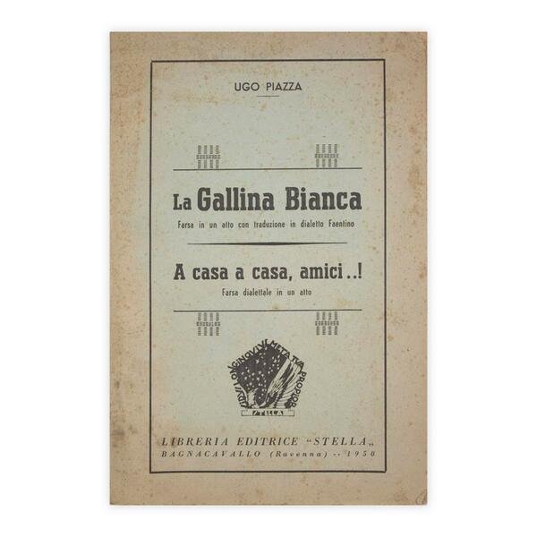 Autore: Ugo Piazza Titolo: La Gallina Bianca Sottotitolo: Farsa in un atto con traduzione in dialetto Faentino - A casa a casa, amici .! - Farsa dialettale in un atto Edizione: Libreria Editrice "Stella" - Ravenna 1950 Dimensioni: 12 x 18,5 cm c.a. Pagine: 59 Copertina: Brossura Condizioni: Ottime come da foto