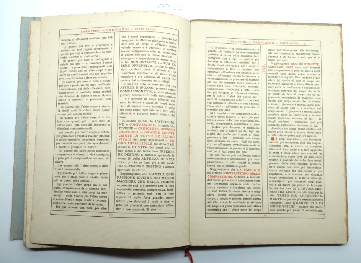 cartella con fascicoli tenuti insieme da due punti di cucitura. testo su due colonne in rosso e nero, legatura morbida editoriale brunita con fioriture al margine dei piatti, alcuni piccoli strappi abrasioni al margine superiore dei piatti, dorso con piccoli strappi leggermente brunito, quarta di copertina con alcuni aloni e sporcizie, fioriture diffuse alle pagine interne che non ostacolano la lettura, capolettera illustrati su sfondo rosso, pagine non numerate dimensioni cm 34,5 * 24,5