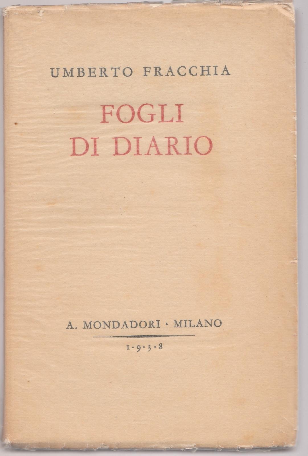 UMBERTO FRACCHIA- FOGLI DI DIARIO MONDADORI 1938-SOVRACOPERTA EDITORIALE CON ALI INTERNE E CON QUALCHE PICCOLA MACCHIA AL PIATTO ANTERIORE RIVESTITA DA CARTA VELINA CON PICCOLI STRAPPI AI MARGINI ESTERNI, COPERTINA EDITORIALE MORBIDA MUTA, TAGLI IRREGOLARI CON LIEVI FIORITURE, FIRMA DI POSSESSO ALL'ANTIPORTA LEGGERMENTE CANCELLATA, INTERNI IN BUONO STATO N. PAG. 280 CM. 19,5 X 13 L3968