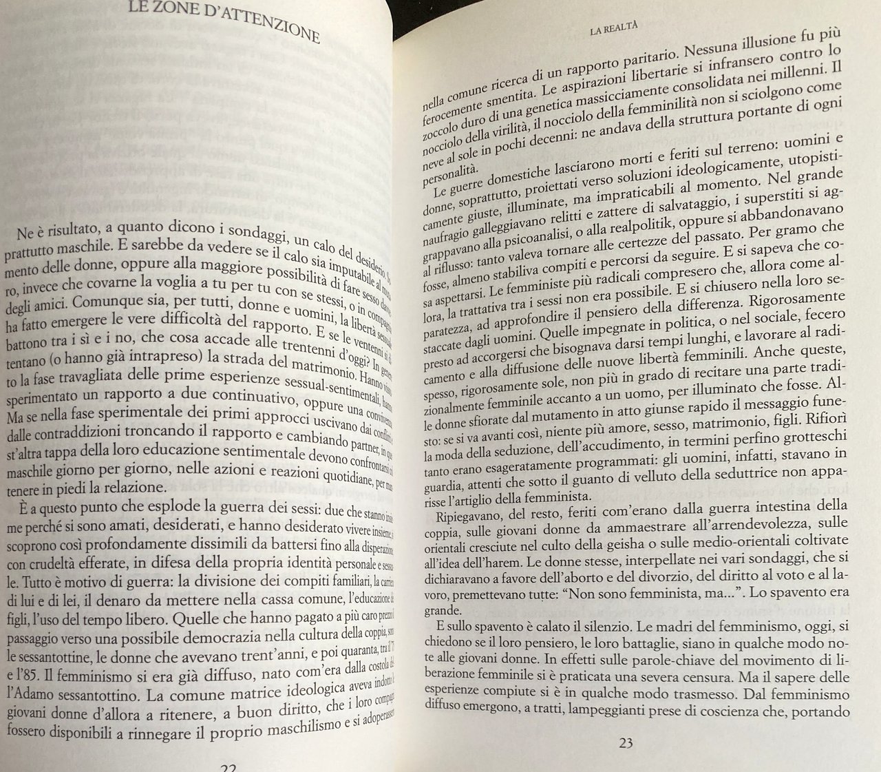 Si procede navigando a vista. Si fa l'amore, si fanno i figli, ci si sposa e poi ci si separa, si va a lavorare, si interrompe e si ricomincia sul filo della maternità. Niente è vietato, niente è permesso. Bisogna inventarsi il percorso di tappa in tappa, da un cerchio all'altro. E ognuna dev'essere disposta a pagare di tasca sua il prezzo della libertà e dei limiti da osservare per ricostruire una femminilità alla ricerca di se stessa.