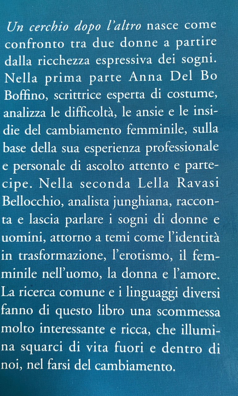 Un cerchio dopo l'altro nasce come confronto tra due donne a partire dalla ricchezza espressiva dei sogni. Nella prima parte Anna Del Bo Boffino, scrittrice esperta di costume, analizza le difficoltà, le ansie e le insidie del cambiamento femminile, sulla base della sua esperienza professionale e personale di ascolto attento e partecipe. Nella seconda Lella Ravasi Bellocchio, analista junghiana, racconta e lascia parlare i sogni di donne e uomini, attorno a temi come l'identità in trasformazione, l'erotismo, il femminile nell'uomo, la donna e l'amore. La ricerca comune e i linguaggi diversi fanno di questo libro una scommessa molto interessante e ricca, che illumina squarci di vita fuori e dentro di noi, nel farsi del cambiamento.
