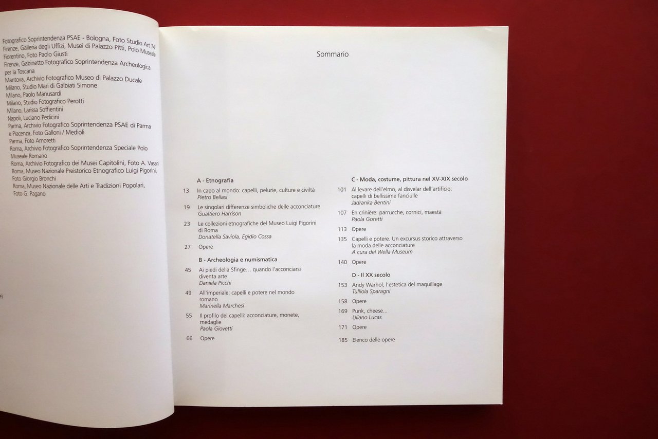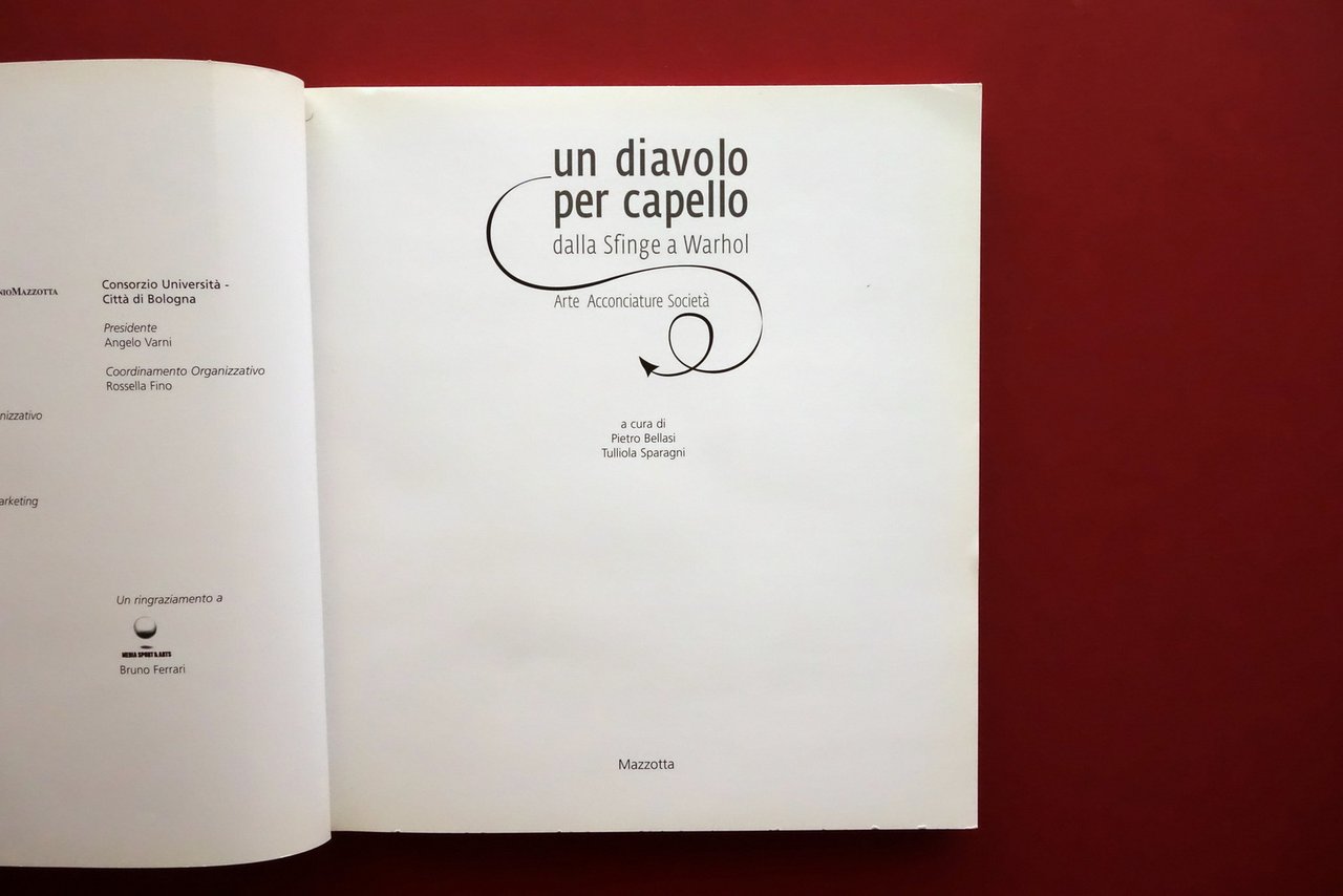 Catalogo, AA. VV., Un Diavolo per Capello dalla Sfinge a Warhol arte - acconciature - società a cura di Pietro Bellasi, Tulliola Sparagni Mazzotta, Milano 2006; cm 24x22; pp. 200 con numerose ill. a colori e in b/n; brossura ed. ill. a colori con bandelle. Condizioni di conservazione Molto ben conservato con minime tracce d'uso; margine inferiore della brossura ant. minimamente sgualcito; cuffia sup. con un minuscolo taglietto in corrispondenza della cerniera anteriore. Interni ottimi, freschi. Catalogo dell'omonima mostra allestita al Museo Civico Archeologico di Bologna, 7 aprile - 2 luglio 2006. Raro, esaurito. SETT21.L26212 N