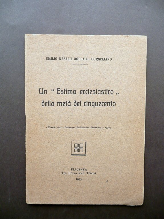 Emilio Nasalli Rocca di Corneliano, Un estimo ecclesiastico" della metà del Cinquecento (Estratto dall' "Indicatore Ecclesiastico Piacentino", 1936) Tip. Bricca succ. Tononi, Piacenza 1935, cm 17,5x12, pp. 24; brossura ed. Condizioni di conservazione Esemplare in buone condizioni con leggere tracce di utilizzo. SC03.D12151 N "
