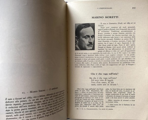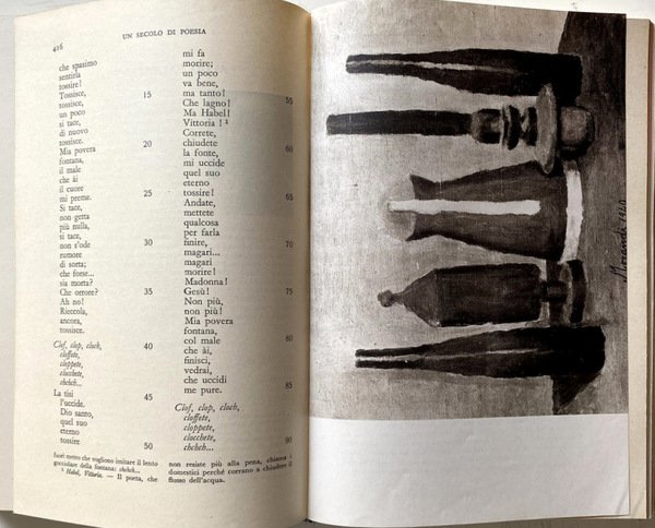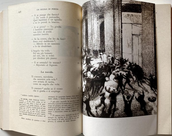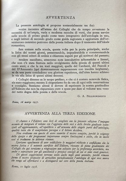Soggetti: Letteratura italiana, Poesia, Antologie critiche, Critica letteraria, Metrica, Stile, Stili letterari, Correnti letterarie, Poeti, Stilistica, Scrittura, Poesie, Classici, Raccolte poetiche, Didattica, Manuali, Ottocento, Novecento, Collezionismo, Lirica, Poetica, Ermetismo, Simbolismo, Romanticismo, Idealismo, Impegno civile, Intellettuali, Narrativa, Opere generali, Libri Vintage Fuori catalogo, Scolastici antichi, Libri rari, Dialettale, Salvatore Di Giacomo, Trilussa, Minori, Giorgio Caproni, De Pisis, Barile, Orelli, Umberto Saba, Elpidio Jenco, Titta Rosa, Betti, Bartolini, Alessandrini, Alfonso Gatto, Giuseppe Ungaretti, Eugenio Montale, Salvatore Quasimodo, Giovanni Papini, Campana, Folgore, Jahier, Marino Moretti, Govoni, Guido Gozzano, Tommaso Marinetti, Buzzi, Tito Marrone, Sibilla Aleramo, Giovanni Cena, Vittoria Aganoor Pompilij, Gabriele D'Annunzio, Pezzani, Giovanni Pascoli, Ada Negri, Giosuè Carducci, Scapigliatura, Emilio Praga, Arrigo Boito, Iginio Ugo Tarchetti, Giuseppe Chiarini, Arturo Graf, Antonio Fogazzaro, Ippolito Nievo, Scrittori, Risorgimento, Romanticismo, Neo-classicismo, Futurismo, Mario Rapisardi, Bibliografia, Saggi critici, Studi culturali, Libri illustrati, Macchiaioli, Pittura, Giovanni Fattori, Giulio Gianelli, Crepuscolarismo, Versi, Rime, Metrica, Endecasillabo, Settenarie, Poesia dialettale, Dialetti, Linguistica, Sandro Penna, Aldo Palazzeschi, Giorgio Morandi, Pittori, Guerre mondiali, Mario Sironi, Futuristi, Titti Rosa Giovanni, Cesare Pavese, Govoni, Luzi, Pier Paolo Pasolini, Ippolito Nievo, Leopardi, Attilio Bertolucci, Bontempelli, Berchet, Belli, Boito, Nigra, Prati, Zanetta, Fogazzaro, Olindo Guerrini, Tarchetti, Bettini, Renzo Pezzani, Villaroel, Tito Marrone, Buzzi, Francesco Gaeta, Sbarbaro, Comes, Virgilio Giotti, Berto Barbarani, Sebastiano Satta, Angelo Frattini, Cesare Pascarella, Vittorio Sereni, Italian literature, Poetry, Critical anthologies, Literary criticism, Metrics, Style, Literary styles, Literary currents, Poets, Stylistics, Writing, Poems, Classics, Poetic collections, Didactics, Manuals, Nineteenth century, Twentieth century, Collectibles, Lyricism, Poetics, Hermeticism, Symbolism, Romanticism, Idealism, Civil commitment, Intellectuals, Fiction, General works, Out of print books, Old scholastics, Rare books, Dialectal, Minors, Writers, Risorgimento, Romanticism, Neo-classicism, Futurism, Bibliography, Critical essays, Cultural studies, Illustrated books, Macchiaioli, Painting, Crepuscularism, Verses, Rhymes, Metrics, Endecasyllable, Septenaries, Poetry in dialect, Dialects, Linguistics, Painters, World Wars, Futurists, Scholastics
