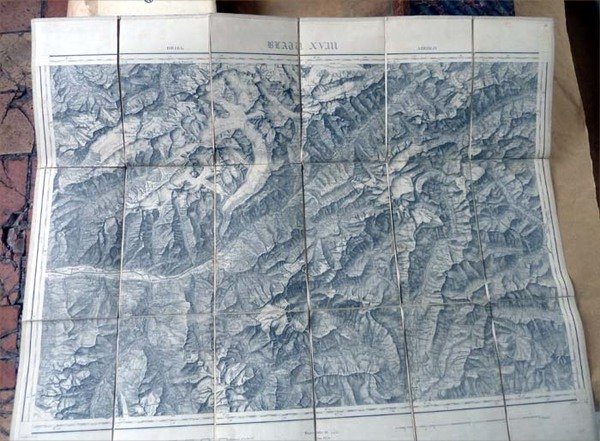 Une carte de la région des Grisons en Suisse de 62x75 cm. Entièrement et soigneusement entoilée et repliée en accordéon. Parfait état. Voir la photo.