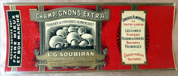 Une chromolithographies pour conserve alimentaire de champignons "Champignons Extra. L.G. Soubiran. Bordeaux. ". Usine de La Moulette à Bergerac. Dimensions: 260x106mm. Bel état. Voir photo.