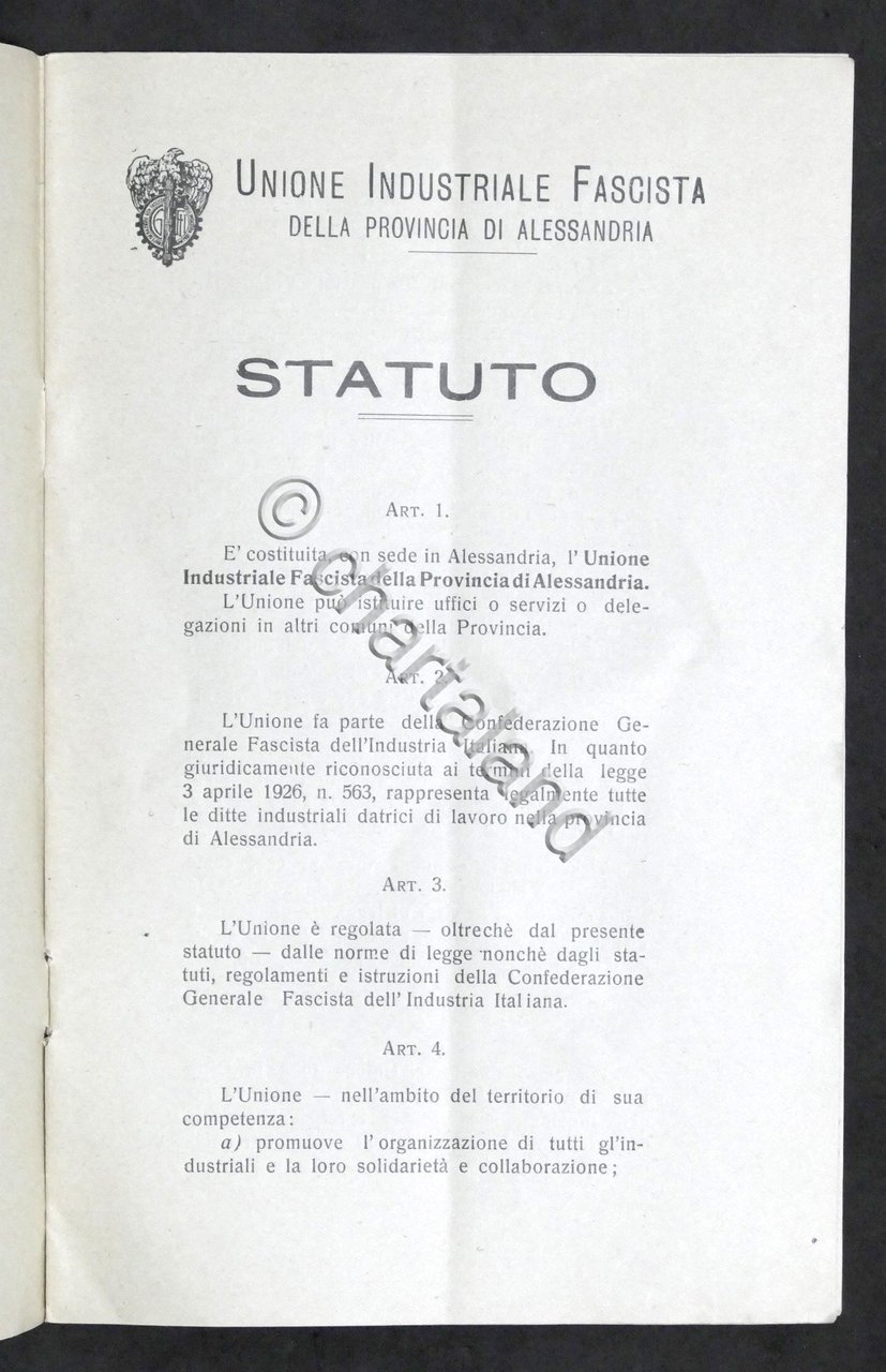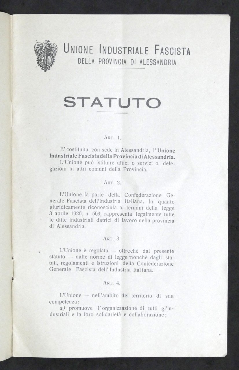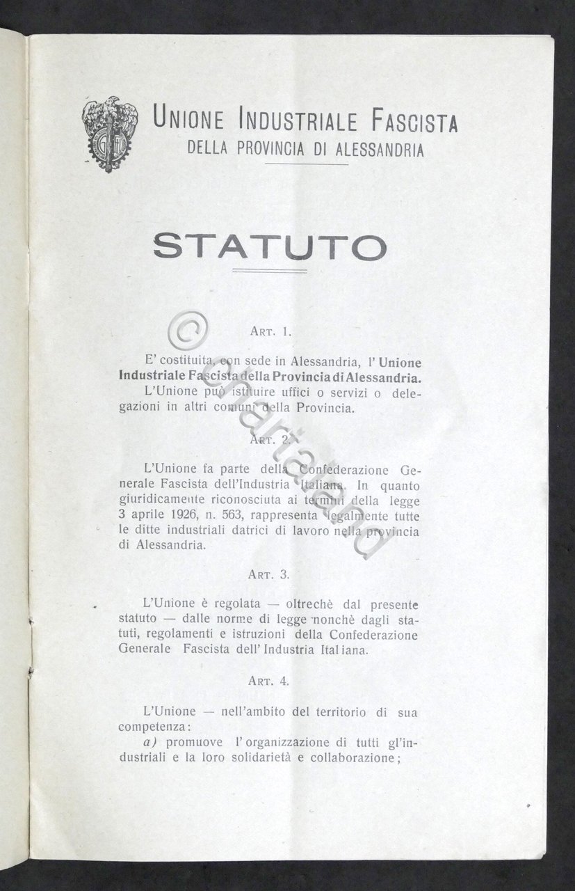 Unione Industriale Fascista della Provincia di Alessandria - Statuto - 1930 ca.