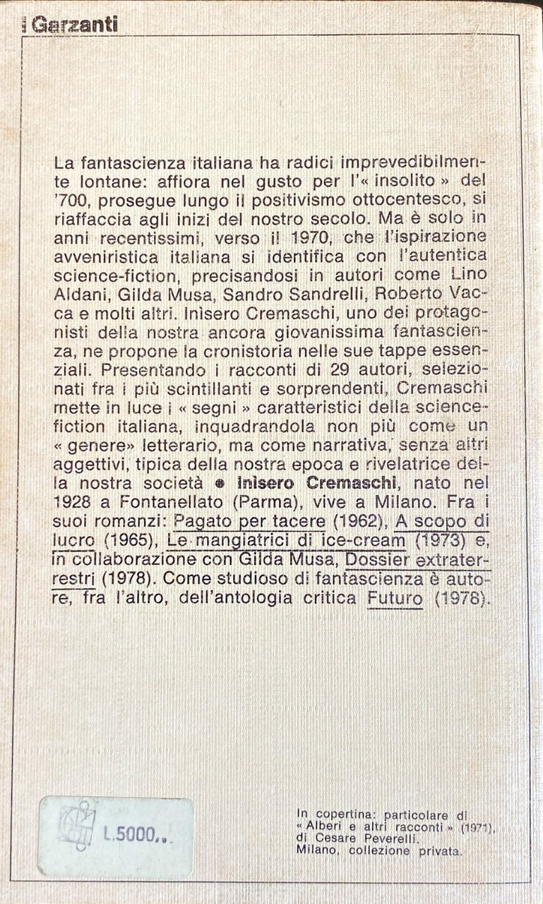 La fantascienza italiana ha radici imprevedibilmente lontane: affiora nel gusto per l'insolito del '700, prosegue lungo il positivismo ottocentesco, si riaffaccia agli inizi del nostro secolo. Ma è solo in anni recentissimi, verso il 1970, che l'ispirazione avveniristica italiana si identifica con l'autentica science-fiction, precisandosi in autori come Lino Aldani, Gilda Musa, Sandro Sandrelli, Roberto Vacca e molti altri. Inisero Cremaschi, uno dei protagonisti della nostra ancora giovanissima fantascienza, ne propone la cronistoria nelle sue tappe essenziali. Presentando i racconti di 29 autori, selezionati fra i più scintillanti e sorprendenti, Cremaschi mette in luce i segni caratteristici della science-fiction italiana, inquadrandola non più come un genere letterario, ma come narrativa, senza altri aggettivi, tipica della nostra epoca e rivelatrice della nostra società.