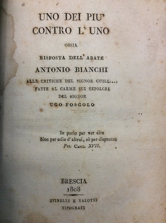 UNO DEI PIU' CONTRO L'UNO. - Ossia risposta dell'Abate Antonio Bianchi alle critiche del Signor Guill.... Fatte al carme Sui Sepolcri del Signor Ugo Foscolo....