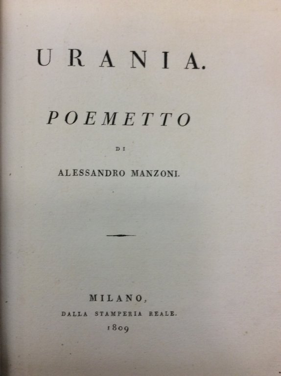 In-8 p. (mm. 233x150), brossura muta coeva di colore blu, pp. 24. "Prima edizione", rarissima a trovarsi perchè fu stampata in un numero limitato di esemplari.Così Parenti Rarità bibl. dell'800, pp. 165-166 che precisa: A Parigi il Manzoni fu lungamente ospite, con la madre, della marchesa di Condorcet, della quale frequentava il salotto con assiduità. A questi legami (e a quelli, soprattutto, di profonda amicizia, che legarono Alessandro al Fauriel ch'era l'amante della Condorcet) pare debba attribuirsi l'origine di un poemetto intitolato ad "Urania" col quale nome apppunto il Fauriel soleva chiamare la sua amica. Esemplare a grandi margini, ben conservato.