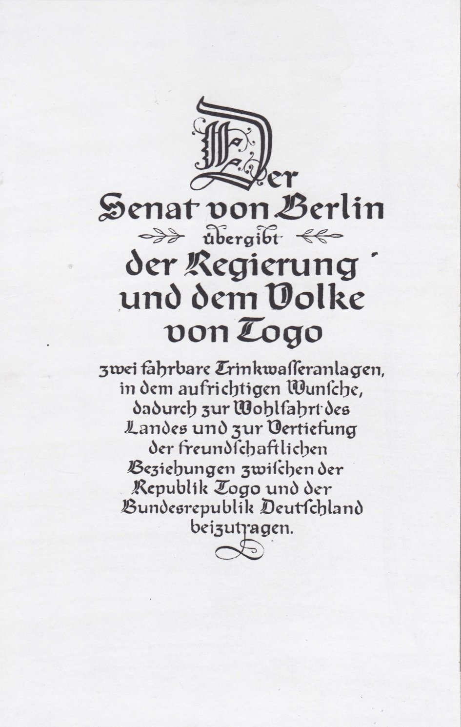 Urkunde zur Übergabe von zwei fahrbaren Trinkwasseranlagen an die Republik Togo im April 1962.