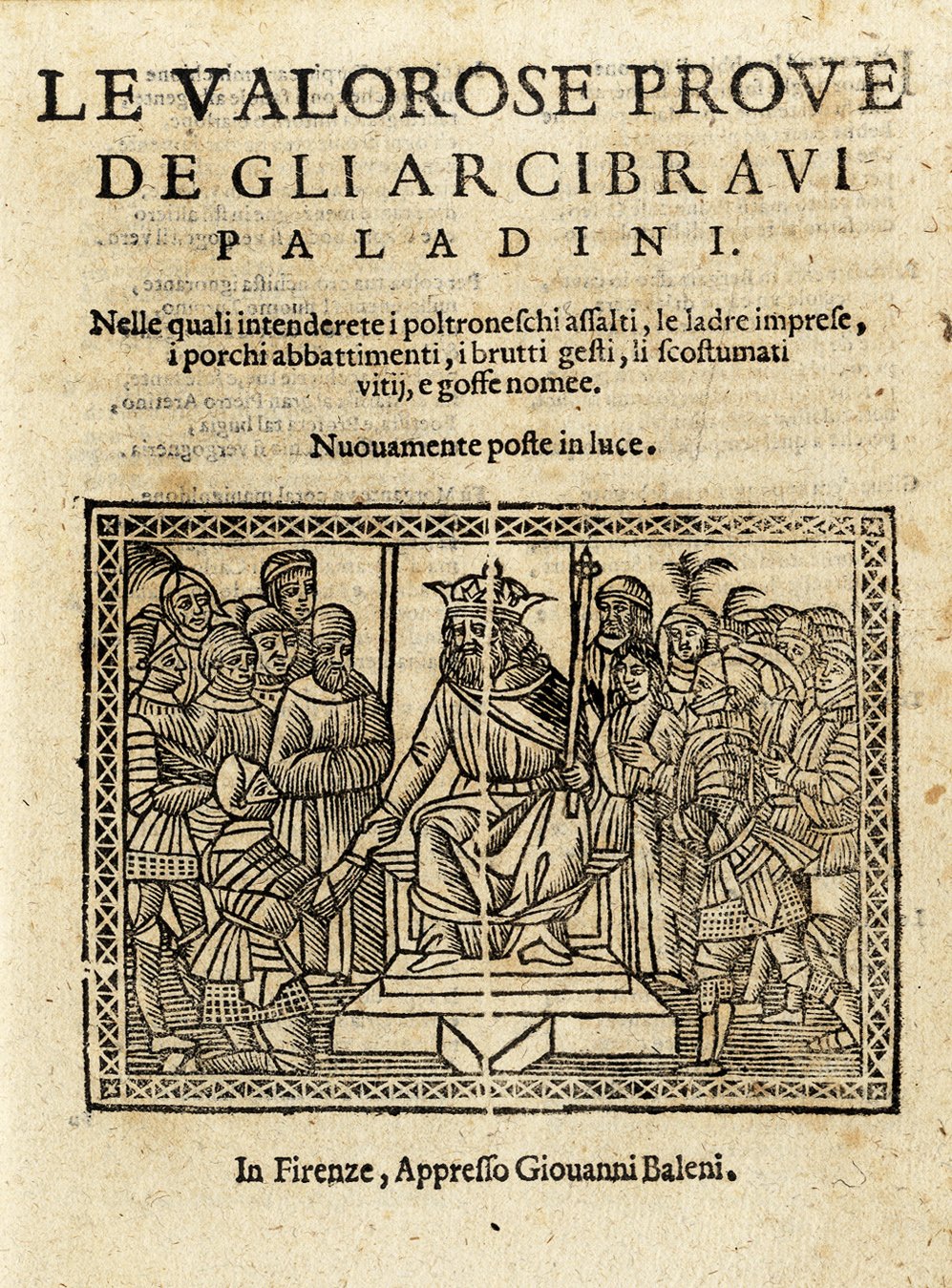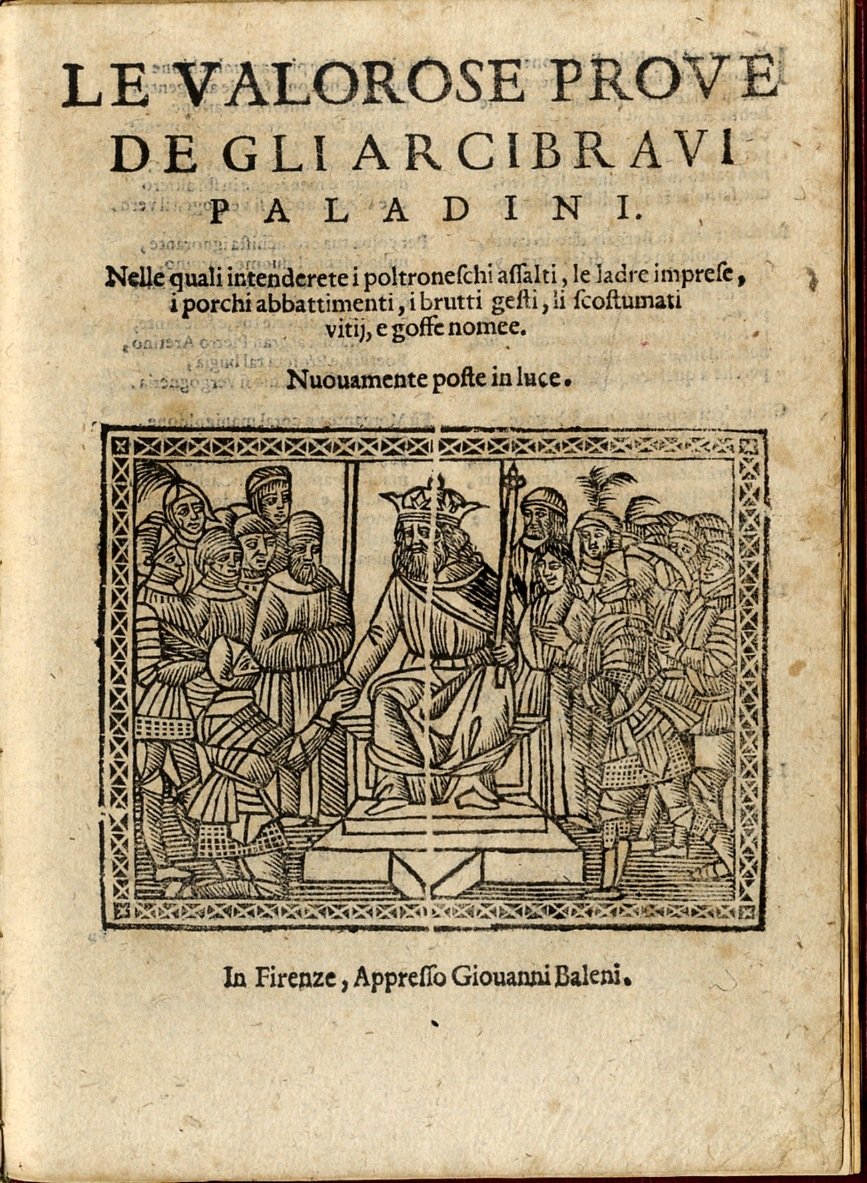 Valorose Prove de gli arcibravi Paladini. Nelle quali intenderete i poltroneschi assalti, le ladre imprese, i porchi abbattimenti, i brutti gesti, li scostumati vitij, e goffe nomee. Nuovamente poste in luce.