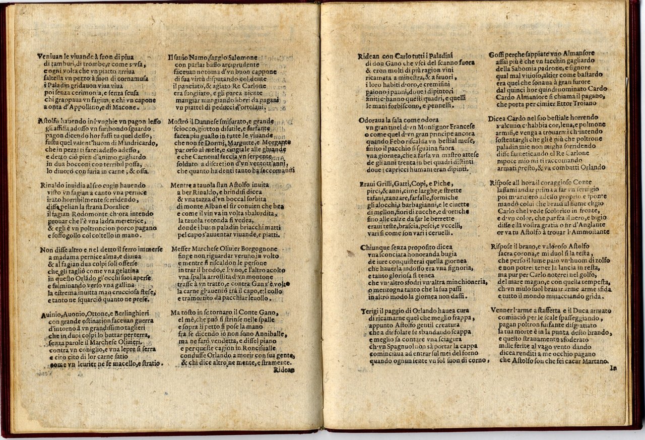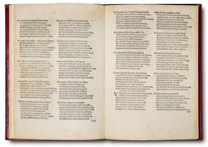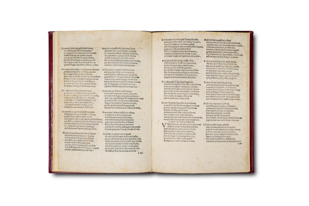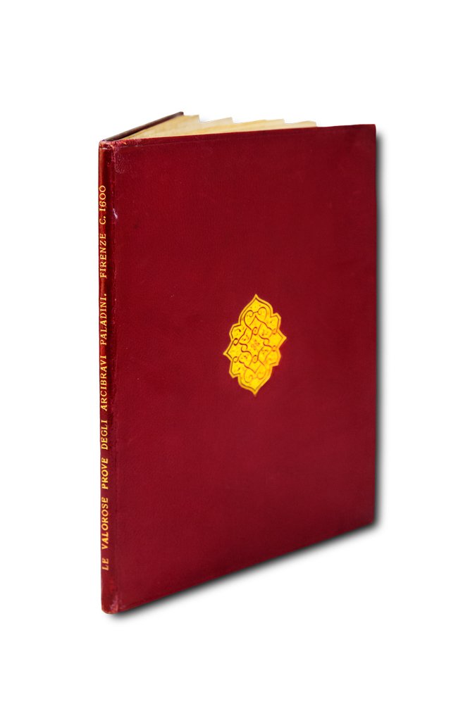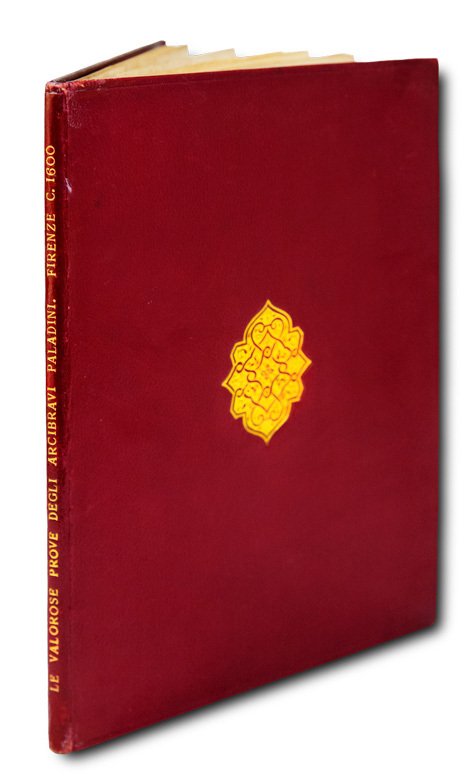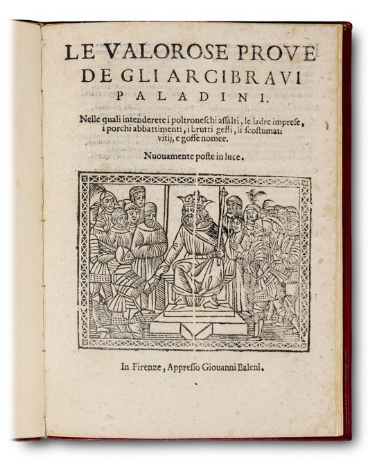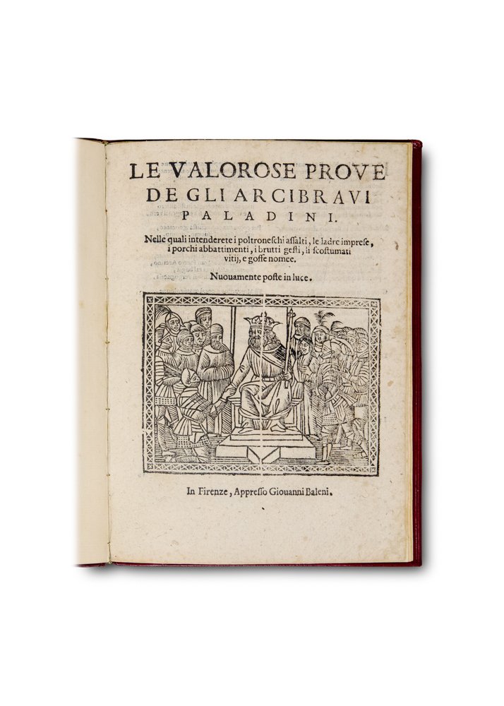 >in-8, (201x143 mm) ff. 4 n.n., legatura d'amatore del XIX secolo in marocchino granata, fleuron impresso in oro al centro dei piatti. Edizione di mitica rarità (apparentemente non censita in nessuna Biblioteca pubblica italiana) di questo componimento eroicomico in due libri in complessive 64 ottave su due colonne. Al titolo magnifica xilografia (mm 86x112) raffigurante probabilmente Carlo Magno in trono circondato dai suoi Paladini, il tutto entro bordura geometrica. Di questo componimento si conoscono almeno quattro ristampe nel XVI secolo, tutte rarissime ed edite a Firenze: la prima del 1568 senza note tipografiche, cui seguirono la presente, quella del 1582 del Pagolini e quella, di nuovo del Baleni, del 1597. La bellissima xilografia fu utilizzata e ricopiata con fedeltà in altre placchette cinquecentesche. Già a metà XVI secolo presentava una spaccatura verticale della matrice lignea. Nella prima edizione e in quelle successive si fa esplicito riferimento alla fonte ariostesca di questo anonimo componimento ''Con alcune stanze d'Orlando alla Birresca'', invece taciuta nella presente edizione. L'anonimo autore parafrasa infatti i più dolci tormenti d'amore dell'Orlando Furioso trasfigurandoli nelle sofferenze dei debitori perseguitati dagli sbirri (''...d'haver tanti suoi debiti à pagare/da quel martir, da quella frenesia/da quella gente detta Birreria''). Soltanto il verso dell'ultimo foglio riporta un titolo corrente in capitali "Furioso alla Birresca" che precede le parodie della prima e seconda ottava del Canto 31, la prima del Secondo e la quinta del trentesimo, nelle quali son modificati e aggiunti versi sul vivere e mangiare bene a dispetto degli Sbirri, della prigione e dell'onestà. ''Le edizioni di questo poemetto sono assai rare. Essendo le prime tre ottave del medesimo simili a quelle che si leggono in altro libretto citate dalla Crusca col titolo di Stanze del Poeta Sciarra (Pietro Strozzi) fu la prima operetta da taluno confusa con la seconda... si descrivono in essa con istile bernesco varie imprese di carlo Magno e de' suoi Paladini'' (Storia ed analisi degli antichi poemi di cavalleria, IV, pp. 222-223). Rarissima placchetta di satirico poemetto cavalleresco, ben conservata nonostante qualche lieve fioritura. Agnelli Ravegnani II, 1568. Sander 5389, note. Un esemplare risulta citato nel 1922 da un bollettino VIII di De Marinis, al n. 113. Storia ed analisi degli antichi poemi di cavalleria, IV, pp. 222-223.