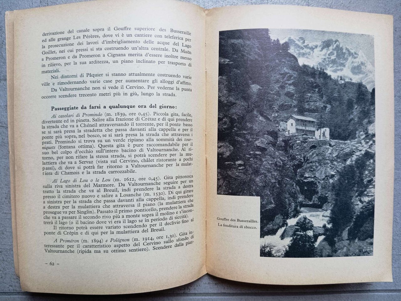 >in-16 (mm 170 x 123), pp. 136, brossura editoriale con illustrazione in B/N, firmata, di Golia. Al suo interno, carta ripiegata f.t. a due colori della Valtournanche. Volume n° 5 della Guida delle Valli d'Aosta, corredata di numerose immagini fotografiche. In fondo, dopo gli indici, inserzioni pubblicitarie. Edizione facilmente fruibile per le sue ridotte dimensioni. Buono stato di conservazione, lieve usura alla cuffia inferiore.