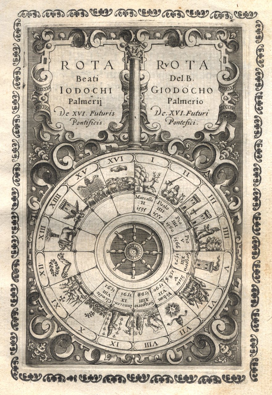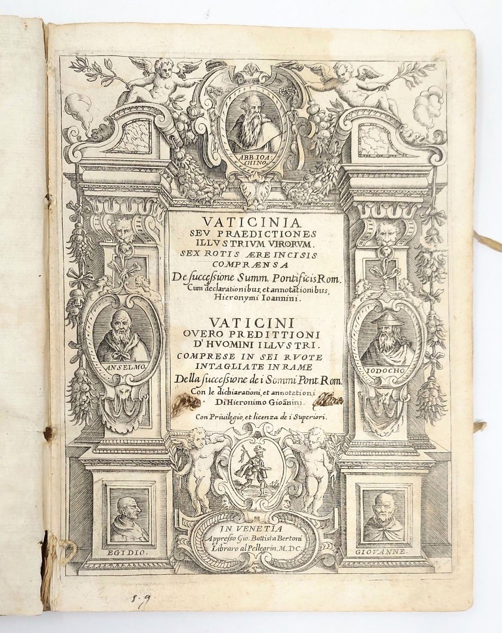Vaticinia seu Praedictiones illustrium virorum, sex rotis aere incisis compraensa. De successione Summ. Pontificis Rom. Cum declarationibus, et annotationibus Hieronymi Ioannini. Vaticini ouero predittioni d'huomini illustri comprese in sei ruote intagliate in rame...
