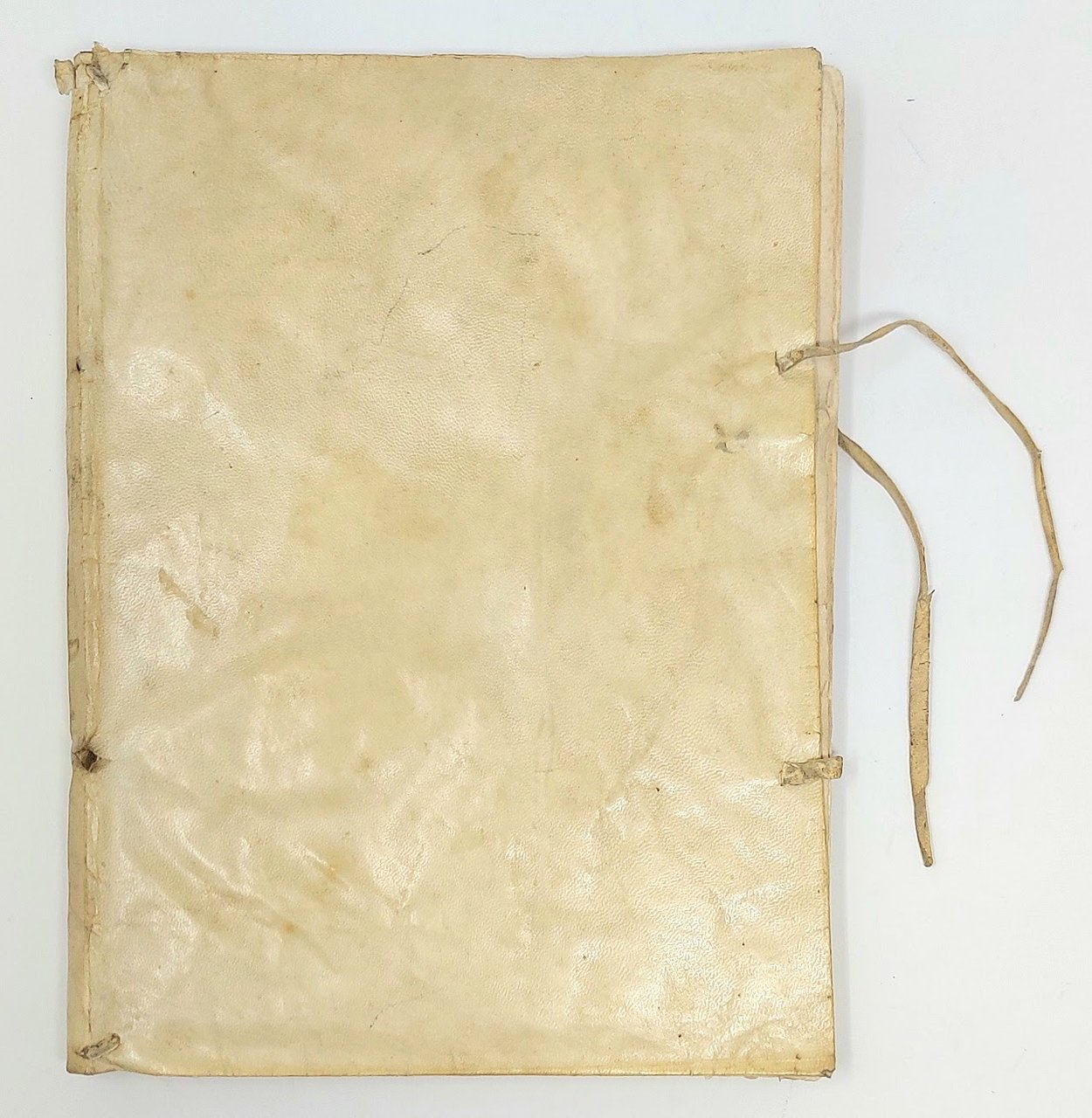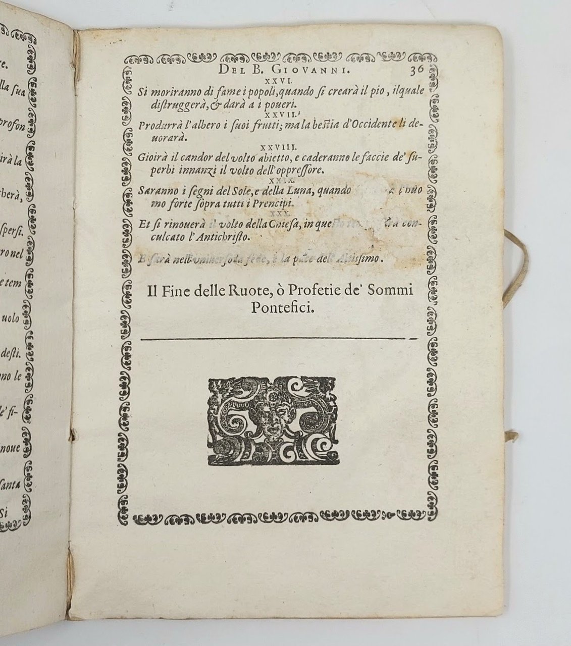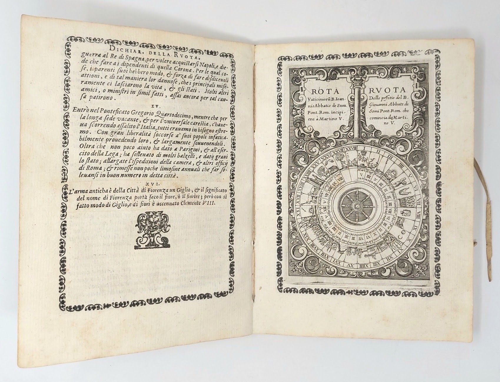 >in-4 piccolo (190x140 mm), ff. 38 (compresi i 2 ff. nn. inseriti tra il 6 ed il 7), legatura coeva in pergamena molle, tracce di legacci. Delle numerose varianti di questa edizione, la presente è L, con dedica dello stampatore ad Alvise Mocenigo (datata 20 settembre 1600). Testo bilingue, latino ed italiano, in carattere tondo il primo e corsivo il secondo. Titolo inciso a motivo architettonico con i ritratti in medaglione dei cinque autori delle profezie (abate Gioacchino da Fiore, vescovo Anselmo, beato Giodocho Palmerio, frate Egidio polacco, beato Giovanni abate); nel testo 6 figure a piena pag. (5 ruote profetiche ed una ''gieroglifica'' al verso del f. 8), intagliate in rame a Venezia nel 1589 da Girolamo Porro; ogni pagina racchiusa in bordura ornamentale, testatine, finalini ed iniziali. Rara opera, che alcuni bibliografi registrano sotto Gioacchino da Fiore, ma i più sotto Giovannini, l'autore delle dichiarazioni ed annotazioni presenti in quest'edizione. Fascette stampate applicate ad integrare o a coprire i testi, e porzioni di testo abrase (benché leggibili), risultato della pesante opera di censura notoriamente subita da questa edizione. L'esemplare, come altri consultati, fu epurato appena dopo la stampa dei testi più controversi. Laddove in alcuni casi vennero applicati fregi xilografici a coprire il testo, nel presente molte parti censurate sono state riapplicate con fascette ove illegibili, o lasciate abrase in seguito alla rimozione delle fascette di censura in quanto ancora leggibili. Ne è evidente testimonanzia l'abrasione del paragrafo sull'Anticristo alla carta 36. Esemplare molto genuino (leggera gora d'umido al margine interno dei primi 10ff. e lievi abrasioni dove il testo fu coperto per censurarlo). Ediz. mancante a Caillet e Casanatense (altre ediz. che registrano sotto Gioacchino). Dorbon 2281 (sotto Joachimus ed insieme ad altra opera). Adams G-628. Michel-Michel IV, 54. STC 303. Rosenthal 1516. Cat Vinciana 2190 (ediz. poster.).