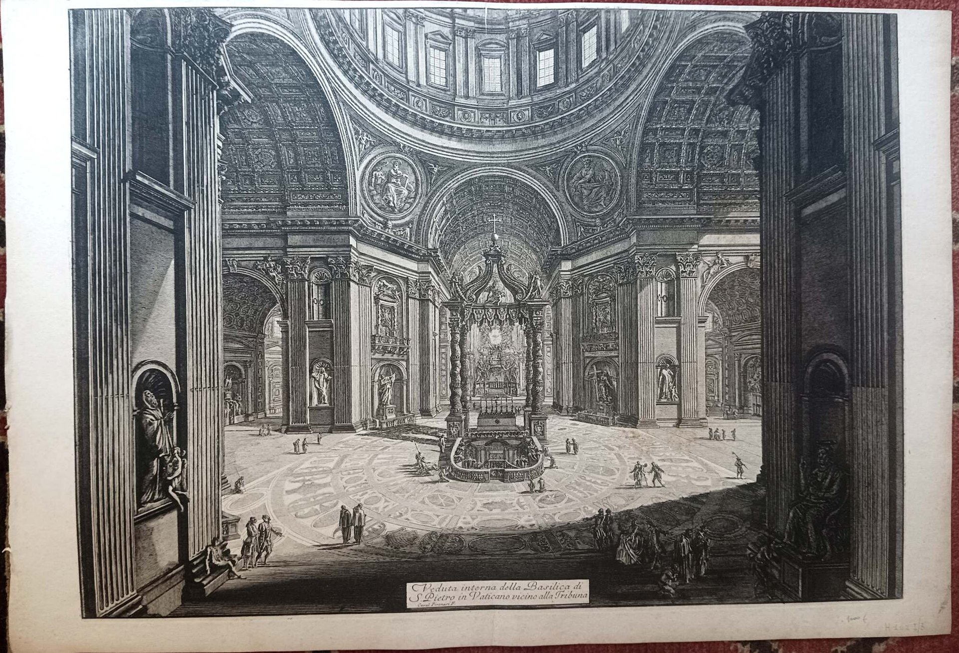 >Acquaforte originale (mm 485x668 e margini). Titolo in basso, centrale, entro cartiglio, cui segue la firma "Caval. Piranesi F.". Primo stato su tre. Tratta dalla celebre serie di 135 “Vedute di Roma disegnate ed incise da Giambattista Piranesi Architetto Veneziano” (eseguite dal 1748 al 1778), capolavoro dell'incisione di tutti i tempi. Questa celebre serie di acqueforti, iniziata intorno all'anno 1747, rappresenta l'opera più nota e richiesta della produzione artistica dell'autore. Mediante questo ambizioso progetto iconografico, ampliato nel corso degli anni, l'artista offrì al pubblico un'immagine sistematica e teatralmente suggestiva della Roma barocca con la sua urbanistica trionfale e seppe evocare con straordinaria forza espressiva il mistero e la grandiosità delle rovine dell'antica Roma. Buon esemplare impresso su carta pesante, vergellata, con fioriture , traccia di antica piega centrale.