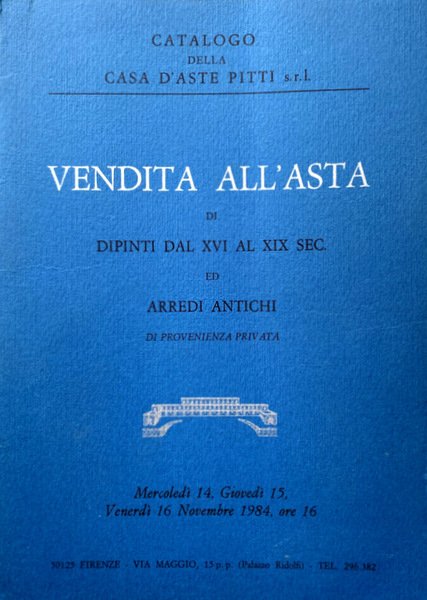 VENDITA ALL'ASTA DI DIPINTI DAL XVI AL XIX SECOLO ED ARREDI ANTICHI DI PROVENIENZA PRIVATA. MERCOLEDÌ 13, GIOVEDÌ 15, VENERDÌ 16 NOVEMBRE 1984, ORE 16