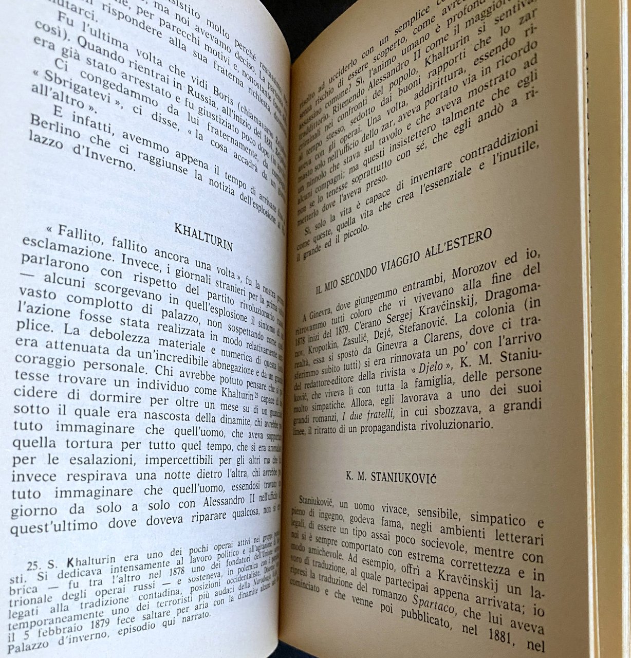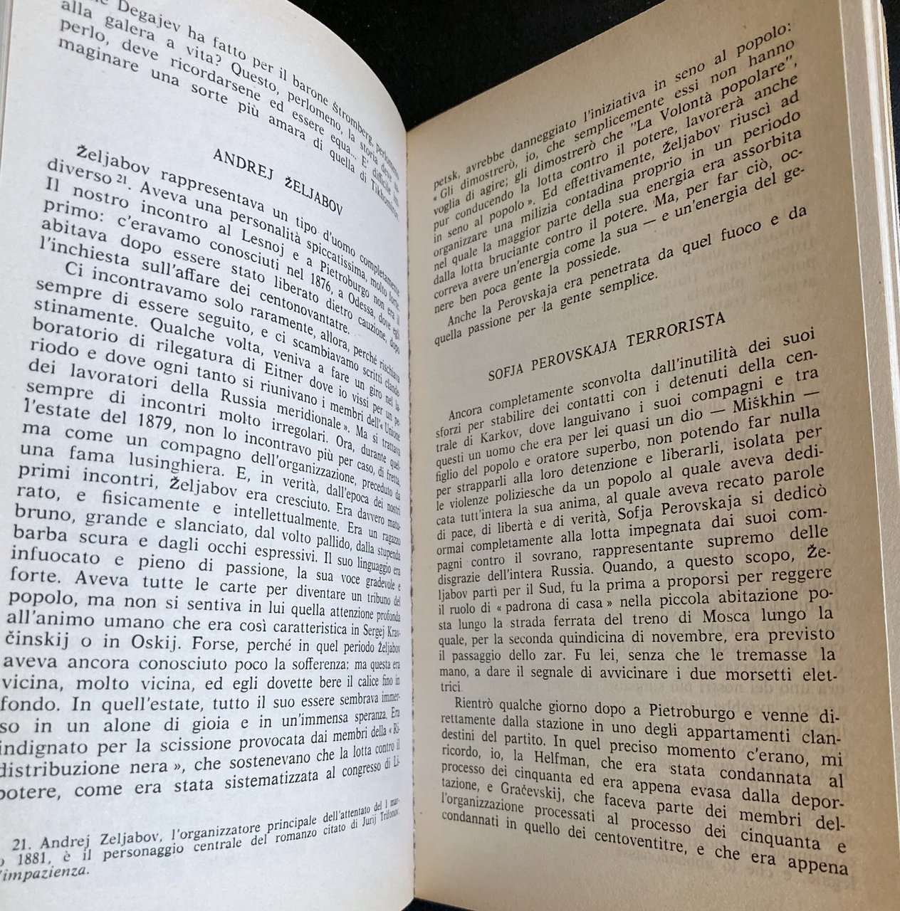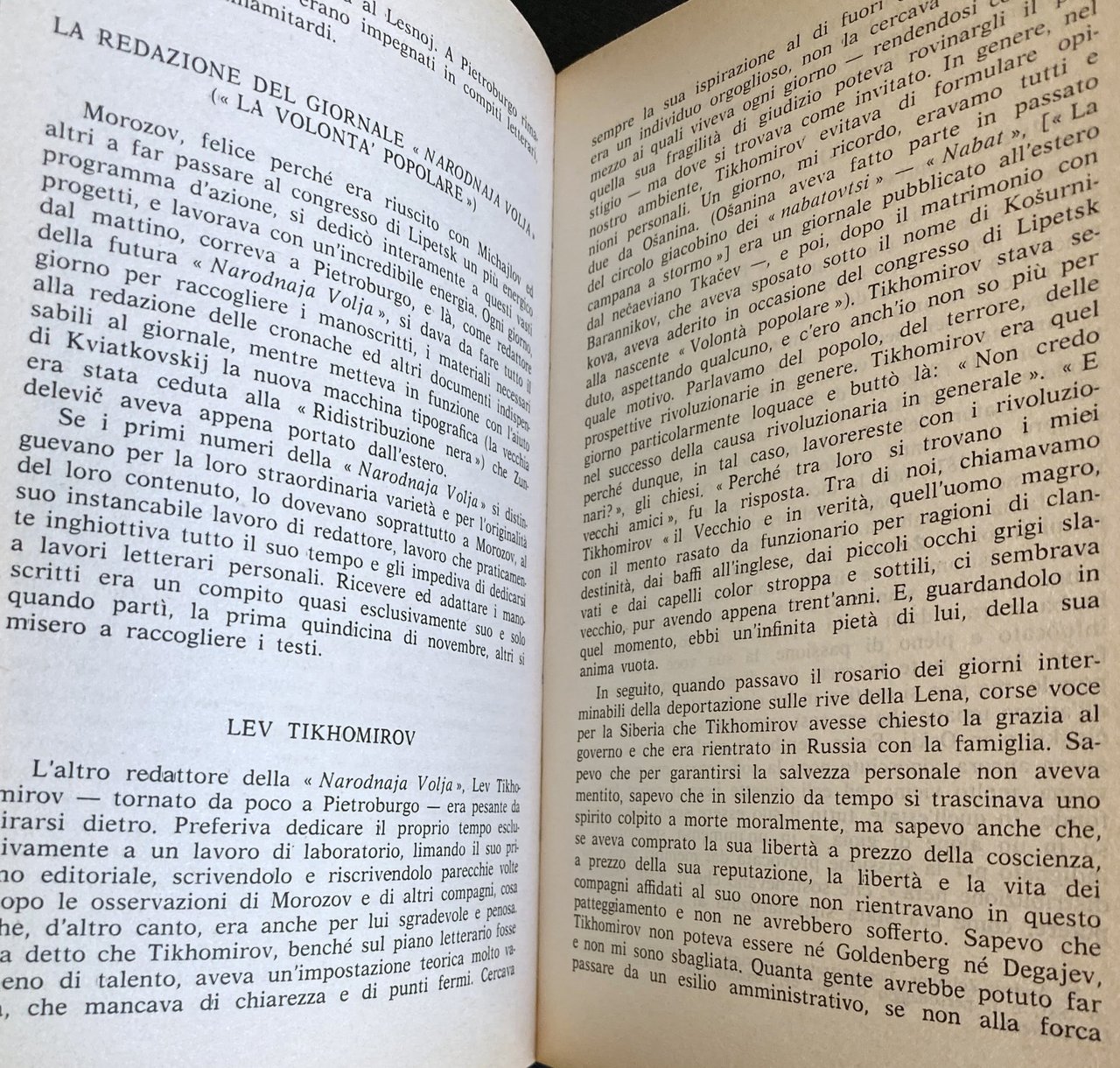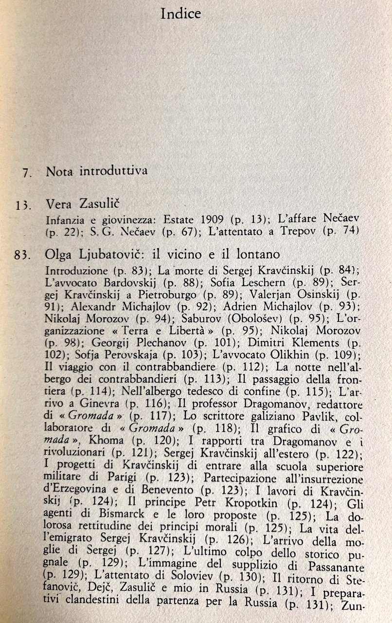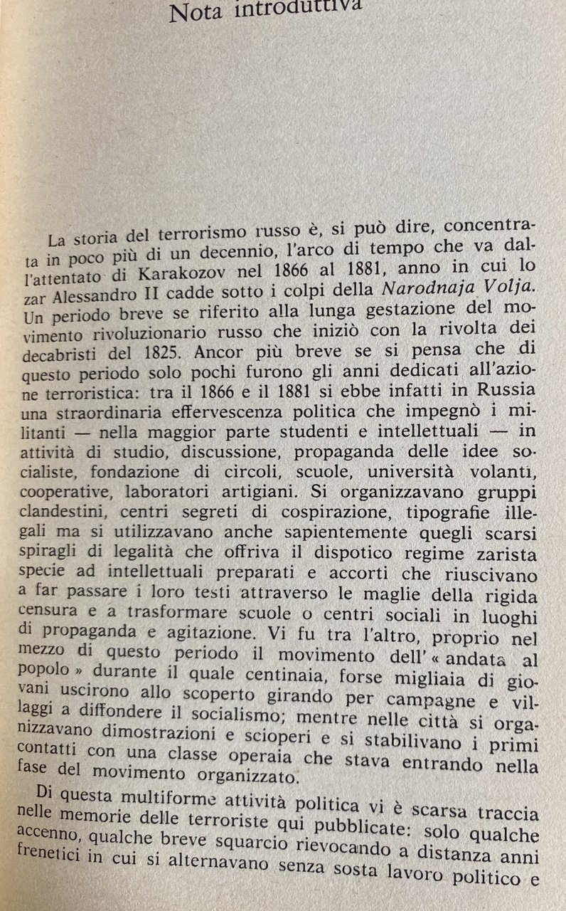 Soggetti: Storia di genere Politica Donne russe Terroriste Terrorismo Biografie Memorie Vita Impegno civile Lotta armata Novecento Affare Necaev Attentati Trepov Morte Sergej Kravcinskij Assassinio politico Omicidio Bardovskij Leschern San Pietroburgo Valerjan Osinskij Alexandr Michajlov Adrien Nikolaj Morozov Saburov Obolosev Organizzazioni Terra e Libertà Georgij Plechanov Dimitri Klements Sofia Perovskaja Olikhin Viaggio Contrabbando Contrabbandieri Frontiera Confini Ginevra Dragomanov Gromada Riviste politiche Clandestinità Intellettuali Pavlik Khoma Rivoluzionari Rivoluzione bolscevico Comunisti Comunismo Antizarismo Rivolte Estero Francia Russia Parigi Insurrezioni Erzegovina Benevento Principe Petr Kropotkin Anarchici Anarchismo Agenti segreti Servizi Stato Bismarck Emigrati Esilio Passanante Soloviev Stefanovic Dejc Zasulic Zundelevic Frontiere Congressi Lipetsk Voroneje Mosca Jurkovskij Saska Sasha Ridistribuzione nera Alessandro II Giornali Narodnaja Volja Lev Tikhomirov Andrej Zeljabov Arresti Kviatkovskij Polizia segreta Sablin Bukh Sofya Ivanovna Tsukkerman Picka M. Griaznova Kilbacise Comitato esecutivo Khalturin Staniukovic Hartmann Gambetta Podolinskij Autobiografia Collezionismo Saggi Libri rari Vintage fuori catalogo Bibliografia Riferimento Campagne Contadini Socialismo Socialisti Attività Università Catechismo rivoluzionario Testi Scritti Documenti Stampa clandestina Sinistra Marxismo Repressione Eroine Rasprava Byloe Granat Ottocento Diario Emancipazione Lavoro Lenin Menscevichi Edinstvo Prima Internazionale Femminismo Contemporanea Karakozov Tipografie illegali Cospirazione Scioperi Proletariato Classe operaia Obscina Comunitarismo Franco Venturi Populismo russo Herzen Porter Enzensberger Alexandra Kollontai Figner Fabbriche Rivolta Istruzione femminile Propaganda Bakunin Prigione Odessa Kiev Radicalismo Samizdat Gender History Politics Russian Women Terrorists Terrorism Biographies Memoirs Life Civil Commitment Armed Struggle Twentieth Century Attacks Death Political Assassination Murder St. Petersburg Organizations Land and Freedom Travel Smuggling Smugglers Frontier Borders Geneva Magazines Clandestinity Intellectuals Revolutionaries Bolshevik Revolution Communists Communism Anti-Tsarism Revolts Abroad France Paris Insurrections Herzegovina Prince Anarchists Anarchism Secret Agents State Services Emigrants Exile Frontiers Congresses Moscow Black Redistribution Alexander Newspapers Arrests Police Executive Committee Autobiography Collecting Essays Rare Books Out of Print Bibliography Reference Campaigns Peasants Socialism Socialists Activities University Revolutionary Catechism Texts Writings Documents Clandestine Press Left Marxism Repression Heroines Nineteenth Diary Diaries Emancipation Work Mensheviks First International Contemporary Feminism Illegal Printing Houses Conspiracy Strikes Proletariat Working Class Communitarianism Populism Factories Revolt Female Education Prison Radicalism