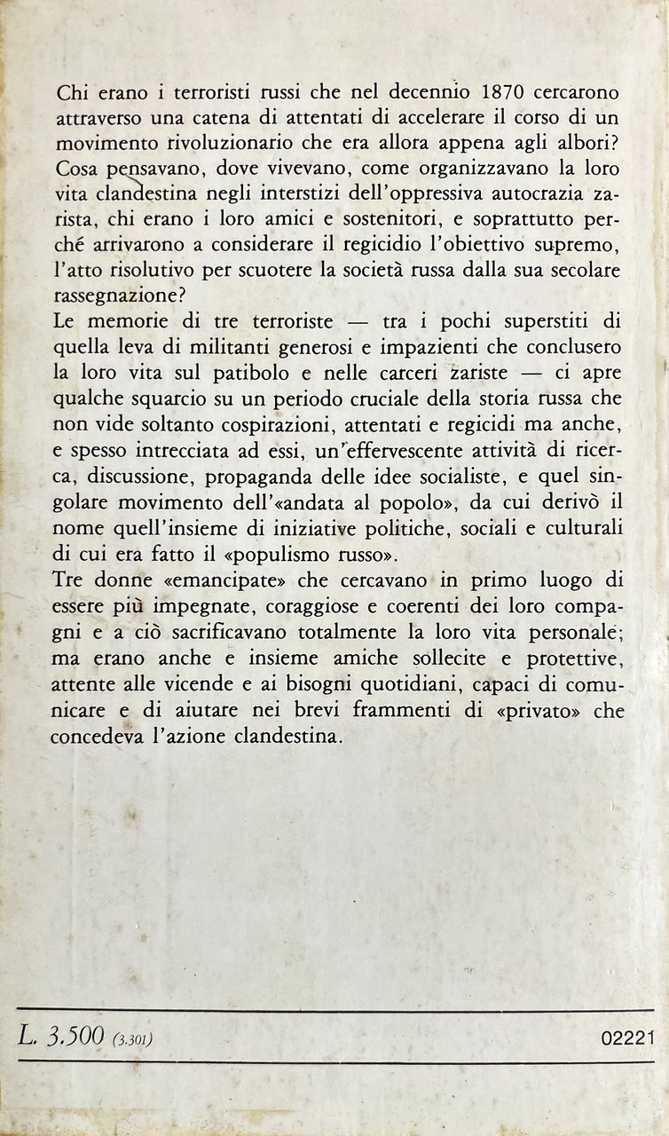 Chi erano i terroristi russi che nel decennio 1870 cercarono attraverso una catena di attentati di accelerare il corso di un movimento rivoluzionario che era allora appena agli albori? Cosa pensavano, dove vivevano, come organizzavano la loro vita clandestina negli interstizi dell'oppressiva autocrazia zarista, chi erano i loro amici e sostenitori, e soprattutto perché arrivarono a considerare il regicidio l'obiettivo supremo, l'atto risolutivo per scuotere la società russa dalla sua secolare rassegnazione? Le memorie di tre terroriste tra i pochi superstiti di quella leva di militanti generosi e impazienti che conclusero la loro vita sul patibolo e nelle carceri zariste ci apre qualche squarcio su un periodo cruciale della storia russa che non vide soltanto cospirazioni, attentati e regicidi ma anche, e spesso intrecciata ad essi, un'effervescente attività di ricerca, discussione, propaganda delle idee socialiste, e quel singolare movimento dell'andata al popolo, da cui derivò il nome quell'insieme di iniziative politiche, sociali e culturali di cui era fatto il populismo russo. Tre donne emancipate che cercavano in primo luogo di essere più impegnate, coraggiose e coerenti dei loro compagni e a ciò sacrificavano totalmente la loro vita personale; ma erano anche e insieme amiche sollecite e protettive, attente alle vicende e ai bisogni quotidiani, capaci di comunicare e di aiutare nei brevi frammenti di privato che concedeva l'azione clandestina.