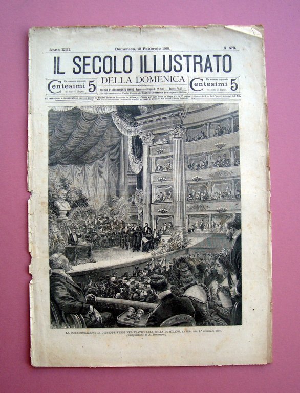 Periodico, Il Secolo Illustrato" della Domenica Anno XIII 10 febbraio 1901 N. 578 Milano, 1901; cm 44,5x31, da pag. 49 a pag 56 (numerazione progressiva annuale); belle incisioni a p.p. all'interno e in copertina. Numero completo. Condizioni di conservazione Esemplare in discrete condizioni con tracce d'uso; dorso con strappeti e piccole mancanze, bruniture e piccole macchiette; margini con strappetti; per le condizioni vedi foto. Numero completo. "La commemorazione di Giuseppe Verdi nel teatro alla Scala di Milano"incisione in copertina pi√π articolo SC03.D19188 F blu "