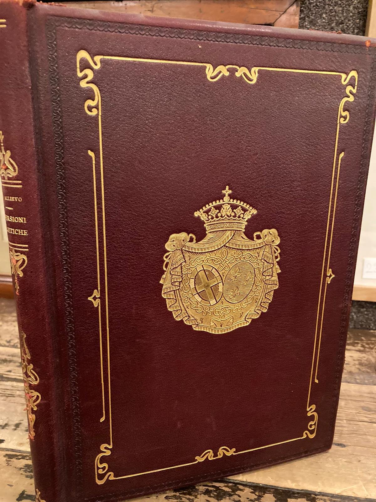 In-4 (cm. 29x22), pp. 147. Splendida legatura da amatore in pieno marrocchino bordeaux con armi di Elena d'Orléans duchessa D'Aosta (25 giugno 1895 - 4 luglio 1931) impresse in oro al piatto anteriore. Taglio di testa dorato. Titolo e fregi in oro al dorso. Ex libris. Contiene per lo più traduzioni da Victor Hugo (fra cui Il Rospo). Dedicatoria a Elena D'Orleans. Pref. di Arturo GRAF. 2 ed. invariata nel testo dalla 1 del 1903, ma piu' elegante in carta forte con barbe. Ottimo esemplare.