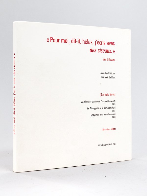 Via di Levare. "Pour Moi, dit-il hélas, j'écris avec des ciseaux". Sur trois livres : Du dépeçage comme de l'un des Beaux-Arts 1976 - La Fils apprête, à la mort, son chant 1981. Beau front pour une vilaine âme 1988 [ Livre dédicacé par l'auteur ]