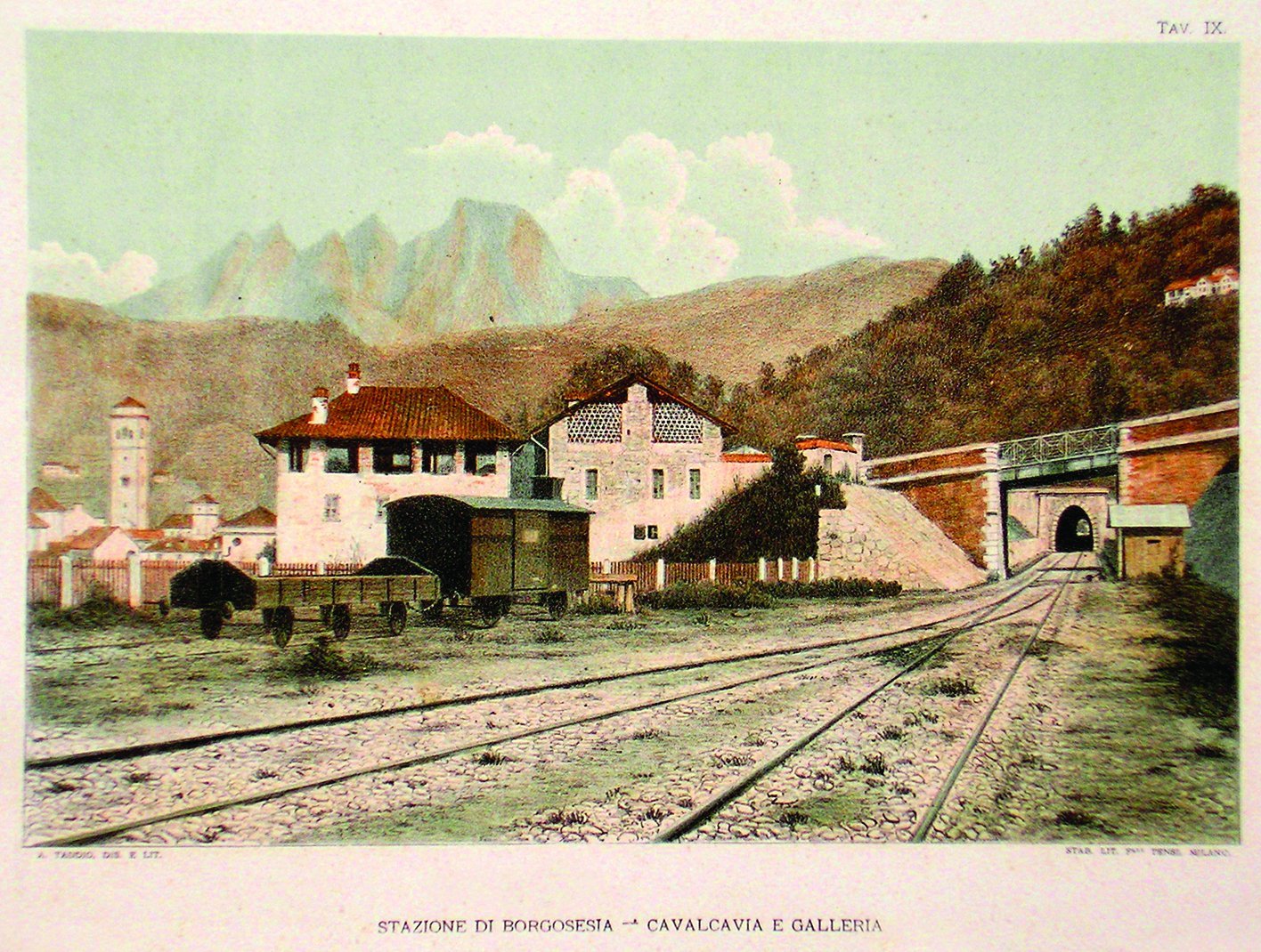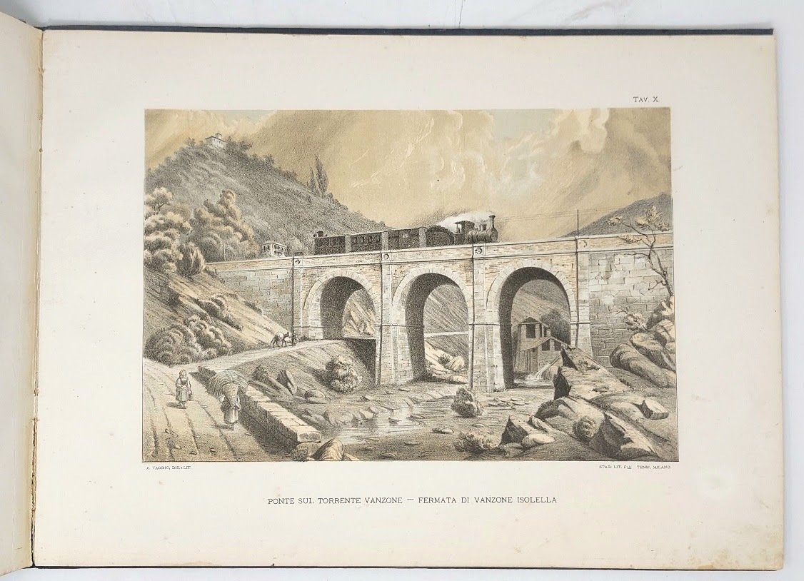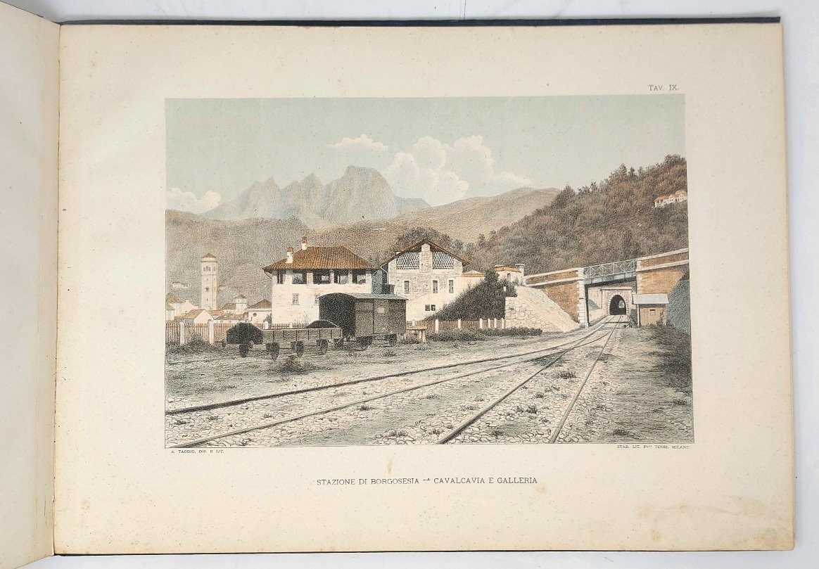 >album in-folio oblungo, leg. editoriale tutta percallina, titolo in oro sul piatto anteriore. Foglio di titolo litografato a due tinte, dedica di Fassò agli Ingegneri G.Antonini e C.Rota, Indice descrittivo delle tavole, 12 magnifiche vedute del pittore novarese Taddio, in litografia a piena pagina, impresse in tre tinte. Le litografie a colore sono tutti scorci ferroviari, di binari con locomotiva attraverso le campagne, e stazioni: vedute di Novara-Bivio Vignale, Ponte sul torrente Agogna, Prato Sesia, Varallo-Ponte sul rio Mangiaia, Viadotto di San Quirico, Trincea della Bettola, Ponta sulla Strona, Stazione di Borgosesia (2), Ponte sul Torrente Vanzone, Ponte di Rocca-Pietra, Varallo-stazione e veduta. Firmate ''A.Taddio dis. e lit. -Litogr. F.lli Tensi, Milano''. Album non comune di paesaggi e località della Valsesia attraversati dalla ferrovia, in ottimo esemplare. Tonetti, Bibliogr. Valsesiana, p.44.