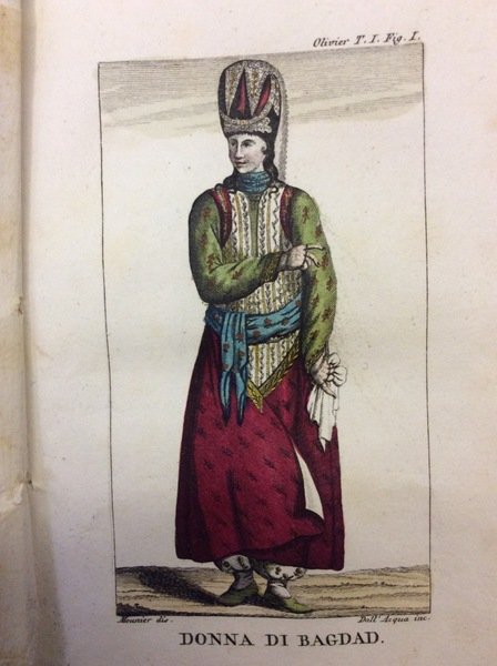 In-16 p. (mm. 151x95), 4 volumi, mz. pelle coeva, fregi e titolo oro al dorso, pp. XVIII,285; 288; 278; 258,(32); molto ben illustrato (come da Indice) da 17 tavole inc. in rame e per lo più colorate a mano, che raffigurano abitanti nei loro costumi locali, monumenti, e rovine. Da Bagdad attraverso la Mesopotamia fino alla Persia, viaggio dettagliatamente descritto dall'A. L'opera fa parte della Raccolta di viaggi dopo quelli di Cook eseguiti tanto per mare quanto per terra, e non pubblicati finora in lingua italiana (tomi VIII-XI).Esemplare con lievi fioriture intercalate nel testo, altrimenti ben conservato.