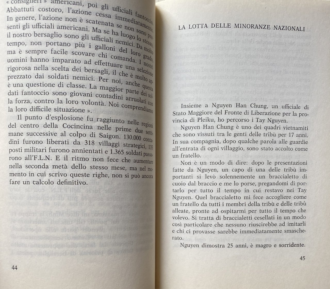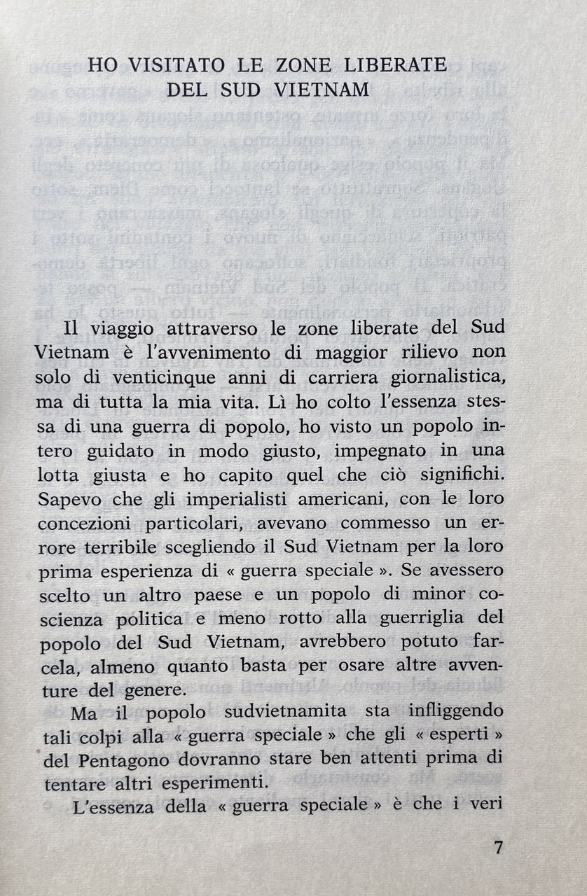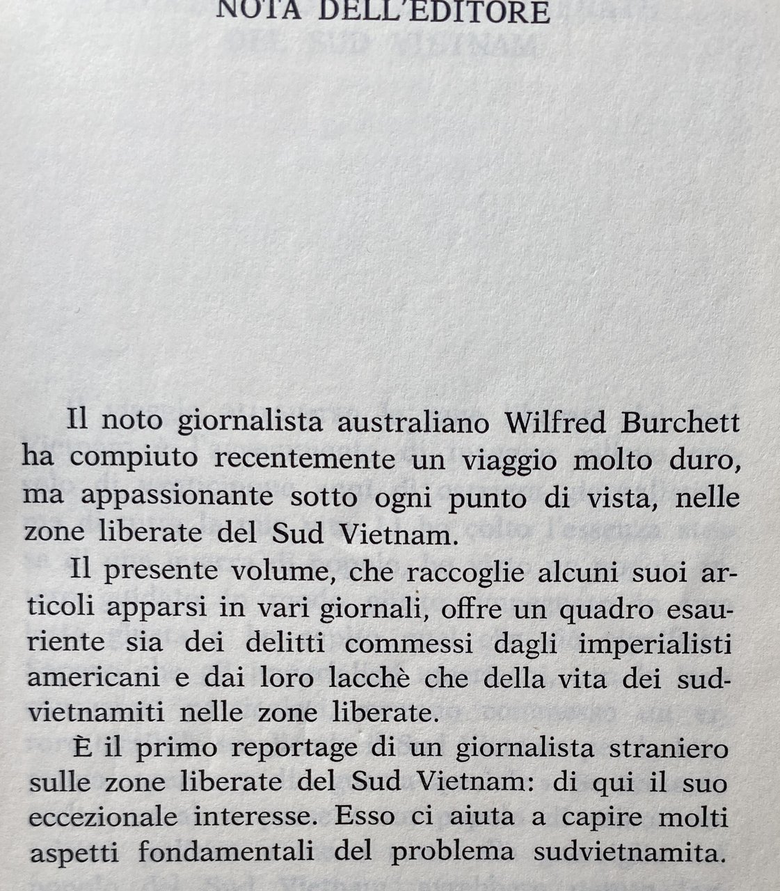 Soggetti: Giornalismo Viaggio Reportage Anni Sessanta Inchieste Guerra Sud Vietnam Liberazione Comunismo New Deal Interviste Nguyen Huu Tho F.L.N. Ho Chi Minh Vo Nguyen Giap Lettere Minority of one Stati Uniti Americani Asia Sudest asiatico Vietcong Guerriglia Guerriglieri Libertà Sconfitta Geopolitica Villaggio Zone liberate Nemico Altipiani Minoranze etniche nazionali Lotta politica Potere popolare Combattenti Morale Truppe fantoccio Lezioni Loc Ninh Biografie Memorie Diario Libri rari fuori catalogo Collezionismo Relazioni internazionali Storia contemporanea Imperialismo Colonialismo Socialismo Le Chau Viet Nam socialista Vittoria Cina Cambogia Indocina Laos Consiglieri Agenti Imboscata Resistenza anti-francese Francia Attacco Ban Me Thuot Battaglione Battaglie Bombe Penisola Ca Mau Comandante Campi di concentramento Coltivazione Darlac Contadini Delta Disertori Truppe Diemist Dinh Nemici Combattimenti Fronte francese Accordi di Ginevra Elicotteri Harkins Hiep Ho Giungla Ucciso Proprietari terrieri Aree liberate LNF Loc Ninh Mekong Postazioni militari Rastrellamenti Montagne Negoziati Pace Nguyen Huu Tho Nguyen Quang Notte Nord Ufficiali Operazioni Phu Yen Aerei Altopiani Pleiku Popolazione Politica Provincia Quang Ngai Repressione Stupri Donne Ragazze Bambine Soldati Quadri Riso Risaie Colpo di stato Saigon Regime Insediamenti Guerra speciale Strategico Tattiche Tay Nguyen Tribale Tribù Unità Forze Fantoccio USA Viet Cong Viet Minh Vietnamiti Armi Feriti Rivoluzione Partito comunista Khmer rossi Sterminio Norodom Sihanouk Buddismo Burattino Diplomazia Ambasciatore Indipendenza Patriottismo Dispacci Pentagono Azione Imboscate Forze armate Propaganda Artiglieria Basi Battaglioni Bombardamenti Città Campagna Esercito Marines Rifugiati Plotone Autodifesa Vo Nguyen Pacifico Pol Pot Tunnel Sottoterra Neofascismo asiatico Rilascio Aviatori Ostaggi Bertrand Russell Nguyen Duy Trinh Partigiani Rhadé Massacri Crimini Massa Tah Nguyen Strategici Yankee go Home Bru Journalism Travel Voyage Sixties Investigations War South Liberation Communism Interviews Letters United States Americans Southeast Vietcong Guerrilla Guerrillas Freedom Defeat Geopolitics Village Liberated areas Enemy Highlands National ethnic minorities Political struggle People's power Fighters Morale Puppet troops Lessons Biographies Memories Diary Rare books out of print Collecting International relations Contemporary history Imperialism Colonialism Socialist socialism Victory China Cambodia Indochina Advisors Agents Ambush Anti-French resistance France Attack Battalion Battles Bombs Peninsula Commander Concentration camps Cultivation Peasants Deserters Troops Enemies Fights French front Geneva agreements Helicopters Jungle Killed Landowners Liberated areas Military posts Roundups Mountains Negotiations Peace Night North Officers Operations Air Highlands Population Politics Province Repression Rapes Women Girls Children Soldiers Paintings Rice Rice fields Coup Saigon Regime Settlements Special Warfare Strategic Tactics Tribal Tribe Unit Forces Puppet Vietnamese Weapons Wounded Revolution Communist Party Reds Extermination Buddhism Puppet Diplomacy Ambassador Independence Patriotism Dispatches Pentagon Action Ambush Armed Forces Propaganda Artillery Bases Battalions Bombings Cities Countryside Army Refugees Platoon Self-Defense Pacific Tunnel Underground Asian Neo-Fascism Release Airmen Hostages Partisans Rhadé Massacres Crimes Mass Strategic