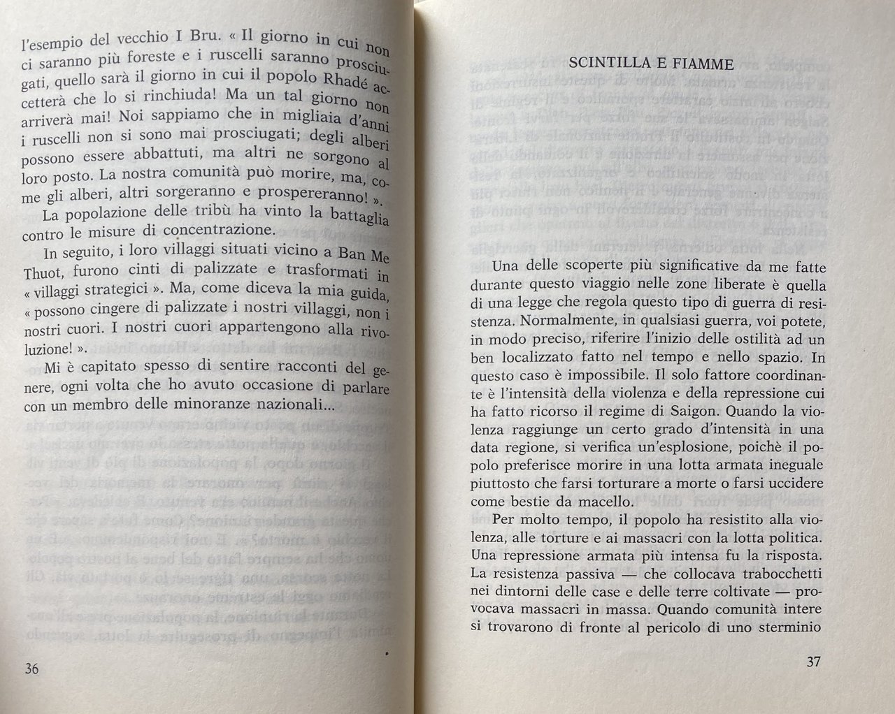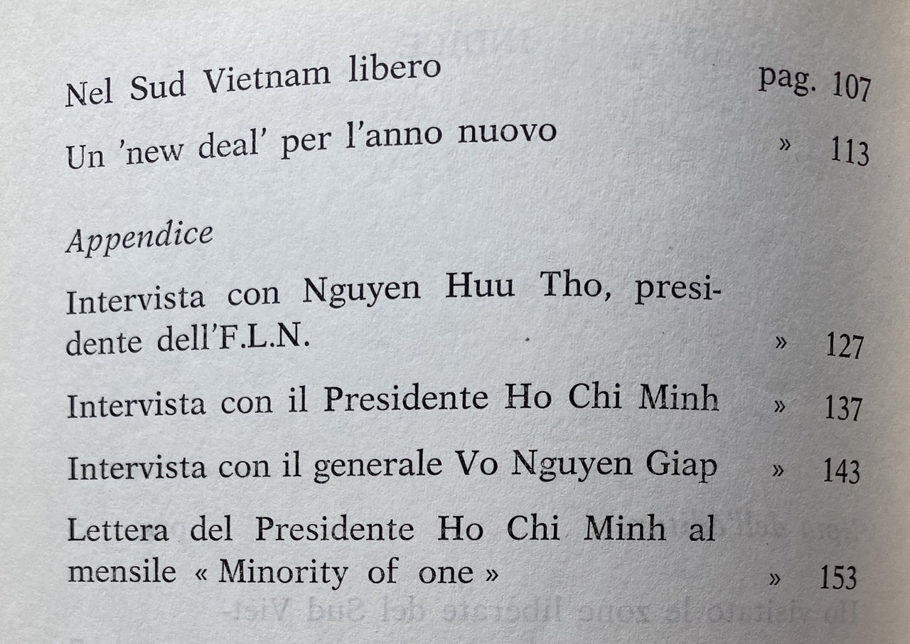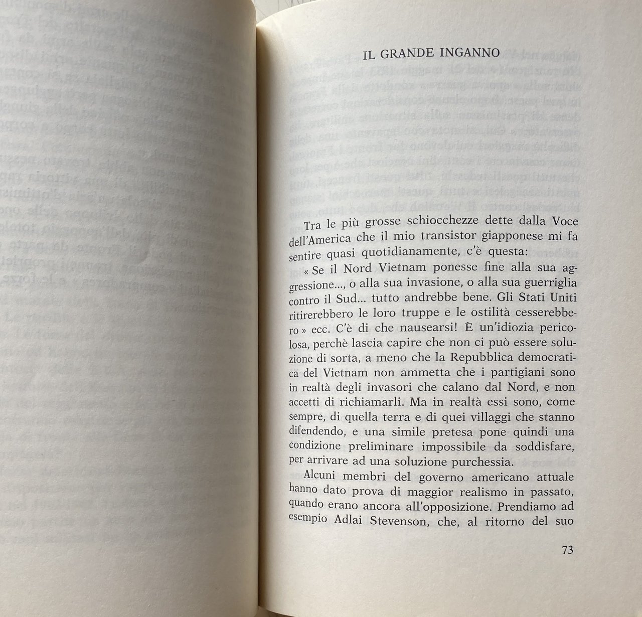 Soggetti: Giornalismo Viaggio Reportage Anni Sessanta Inchieste Guerra Sud Vietnam Liberazione Comunismo New Deal Interviste Nguyen Huu Tho F.L.N. Ho Chi Minh Vo Nguyen Giap Lettere Minority of one Stati Uniti Americani Asia Sudest asiatico Vietcong Guerriglia Guerriglieri Libertà Sconfitta Geopolitica Villaggio Zone liberate Nemico Altipiani Minoranze etniche nazionali Lotta politica Potere popolare Combattenti Morale Truppe fantoccio Lezioni Loc Ninh Biografie Memorie Diario Libri rari fuori catalogo Collezionismo Relazioni internazionali Storia contemporanea Imperialismo Colonialismo Socialismo Le Chau Viet Nam socialista Vittoria Cina Cambogia Indocina Laos Consiglieri Agenti Imboscata Resistenza anti-francese Francia Attacco Ban Me Thuot Battaglione Battaglie Bombe Penisola Ca Mau Comandante Campi di concentramento Coltivazione Darlac Contadini Delta Disertori Truppe Diemist Dinh Nemici Combattimenti Fronte francese Accordi di Ginevra Elicotteri Harkins Hiep Ho Giungla Ucciso Proprietari terrieri Aree liberate LNF Loc Ninh Mekong Postazioni militari Rastrellamenti Montagne Negoziati Pace Nguyen Huu Tho Nguyen Quang Notte Nord Ufficiali Operazioni Phu Yen Aerei Altopiani Pleiku Popolazione Politica Provincia Quang Ngai Repressione Stupri Donne Ragazze Bambine Soldati Quadri Riso Risaie Colpo di stato Saigon Regime Insediamenti Guerra speciale Strategico Tattiche Tay Nguyen Tribale Tribù Unità Forze Fantoccio USA Viet Cong Viet Minh Vietnamiti Armi Feriti Rivoluzione Partito comunista Khmer rossi Sterminio Norodom Sihanouk Buddismo Burattino Diplomazia Ambasciatore Indipendenza Patriottismo Dispacci Pentagono Azione Imboscate Forze armate Propaganda Artiglieria Basi Battaglioni Bombardamenti Città Campagna Esercito Marines Rifugiati Plotone Autodifesa Vo Nguyen Pacifico Pol Pot Tunnel Sottoterra Neofascismo asiatico Rilascio Aviatori Ostaggi Bertrand Russell Nguyen Duy Trinh Partigiani Rhadé Massacri Crimini Massa Tah Nguyen Strategici Yankee go Home Bru Journalism Travel Voyage Sixties Investigations War South Liberation Communism Interviews Letters United States Americans Southeast Vietcong Guerrilla Guerrillas Freedom Defeat Geopolitics Village Liberated areas Enemy Highlands National ethnic minorities Political struggle People's power Fighters Morale Puppet troops Lessons Biographies Memories Diary Rare books out of print Collecting International relations Contemporary history Imperialism Colonialism Socialist socialism Victory China Cambodia Indochina Advisors Agents Ambush Anti-French resistance France Attack Battalion Battles Bombs Peninsula Commander Concentration camps Cultivation Peasants Deserters Troops Enemies Fights French front Geneva agreements Helicopters Jungle Killed Landowners Liberated areas Military posts Roundups Mountains Negotiations Peace Night North Officers Operations Air Highlands Population Politics Province Repression Rapes Women Girls Children Soldiers Paintings Rice Rice fields Coup Saigon Regime Settlements Special Warfare Strategic Tactics Tribal Tribe Unit Forces Puppet Vietnamese Weapons Wounded Revolution Communist Party Reds Extermination Buddhism Puppet Diplomacy Ambassador Independence Patriotism Dispatches Pentagon Action Ambush Armed Forces Propaganda Artillery Bases Battalions Bombings Cities Countryside Army Refugees Platoon Self-Defense Pacific Tunnel Underground Asian Neo-Fascism Release Airmen Hostages Partisans Rhadé Massacres Crimes Mass Strategic
