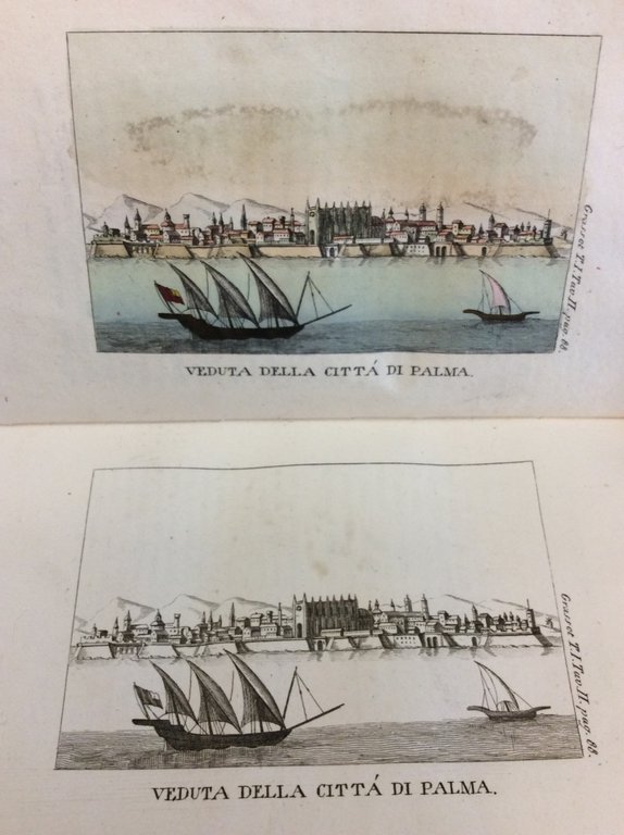 In-16 gr. (mm. 186x110), 2 volumi in 1, mz. pelle coeva con ang., fregi e titolo oro al dorso, conserv. brossure mute coeve, pp. IX,231; 197; illustrati (come da Indice) da 6 tavole inc. in rame di cui 2 colorate d'epoca (con suite in bianco e nero a fronte) che raffigurano costumi, vedute, monumenti e una carta geografica delle isole Baleari. Volumi della collana Raccolta de' viaggi.. nelle varie parti del mondo.. dopo quelli di Cook, e non pubblicati fin ora in lingua italiana.Pesante alone al margine interno delle prime 2 cc. del 1° vol.; fioriture e/o arrossature intercalate nel testo, ma complessivam. buon esemplare, con barbe.