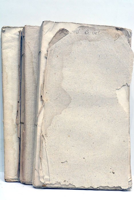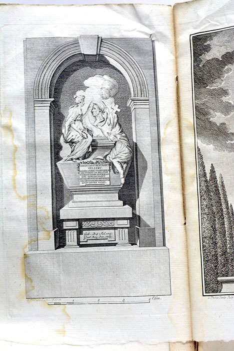 3 volumes. Portrait. 10 pages. 2 planches hors-texte. 192 pages. 3 feuillets. (1 feuillet blanc).+ 2 feuillets. 280 pages. + 2 feuillets. VIII. 270 pages. 1 feuillet. (23x12,5 Cm). Brochés, couvertures muettes. Couverture du loa troisième partie déreliée. Manques et petites déchirures. Première traduction française, due à Marie-Elisabeth Bouée, Dame de Lafite, de la biographie de Gellert par l’historien et littérateur Jean-André Cramer. La vie de Gellert est suivie d’un important recueil de 189 lettres, et des textes suivants: “Des Sentiments Agréables qui peuvent accompagner le Mécontentement et le Chaos”, “De l’Influence que les Belles-Lettres ont sur le cœur humain et sur les Moeurs”, “De l’excellence et des avantages de la dévotion”, et “Pensées sur la Religion”. L’ouvrage est illustré d’un portrait de Gellert, et de 2 planches hors-texte représentant son mausolée et un autre monument élevé à sa gloire. Quelques traces de mouillures. Plis et traces de plis.