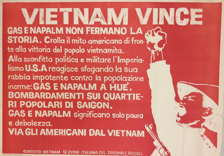 Manifesto litografico a colori (cm.52x72), titoli in bianco su fondo rosso, sul lato destro la sagoma di un combattente vietnamita con pugno alzato.Crolla il mito americano di fronte alla vittoria del popolo vietnamita. Alla sconfitta politica e militare l'Imperialismo U.S.A reagisce sfogando la sua rabbia impotente contro la popolazione inerme: GAS E NAPALM A HUE'. BOMBARDAMENTI SUI QUARTIERI POPOLARI DI SAIGON. GAS E NAPALM significano solo paura e debolezza. VIA GLI AMERICANI DAL VIETNAM.Picc. strappi marginali, altrimenti ben conservato..