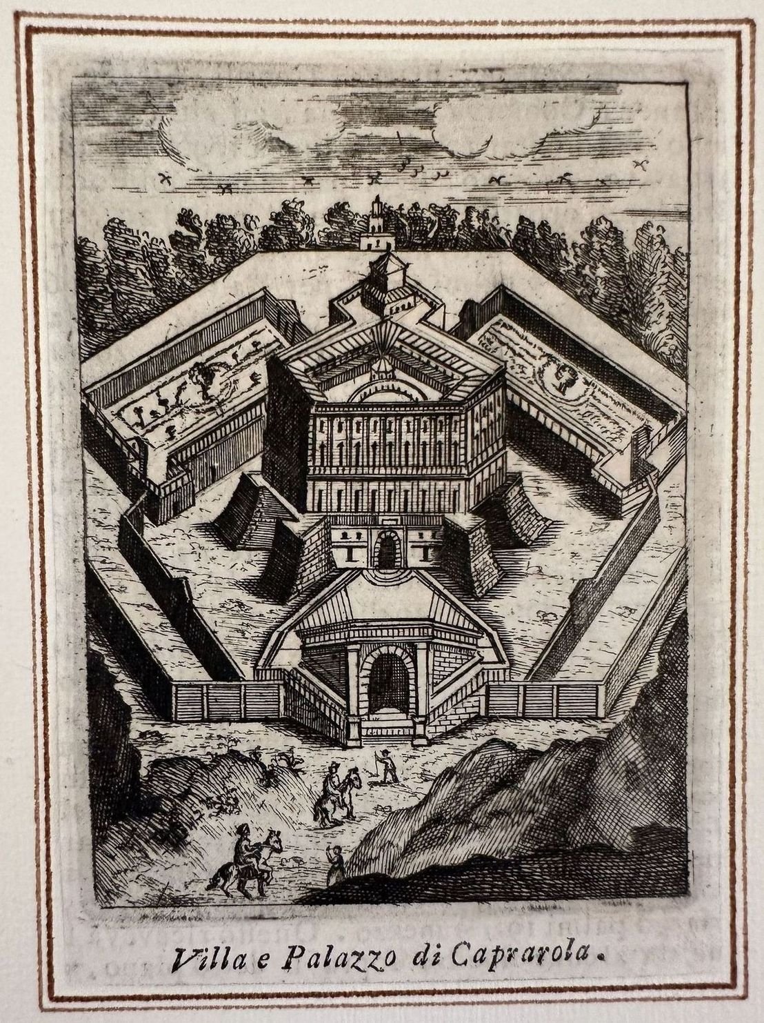 Veduta animata della Villa e Palazzo di Caprarola (Viterbo) applicata su un cartoncino. Atlante: Descrizione di Roma Antica Autore: Onofrio Panvinio, Famiano Nardini, Alessandro Donati Data: XVII secolo Tecnica: incisione su rame Dimensione del foglio: 250x175 mm Dimensione incisione: 115x83 cm Condizioni: Buone. Rare fioriture. Animated view of Villa and Palazzo di Caprarola (Viterbo) applied in a carton base. Atlas: Descrizione di Roma Antica Autore: Onofrio Panvinio, Famiano Nardini, Alessandro Donati Date: 17th century Technique: Copper etching Leaf Dimension: 250x175 mm Engraving Dimension: 115x83 cm Conditions: Good conditions. Occasional foxing.