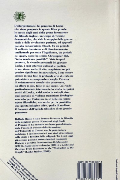 L'interpretazione del pensiero di Locke e che viene proposta in questo libro prende le mosse dagli anni della prima formazione del filosofo inglese, un tempo di vicende drammatiche, che vide lo scoppio della guerra civile e della rivoluzione puritana, ed approdò poi alla restaurazione Stuart. Fu un periodo di radicale incertezza e di disorientamento intellettuale per tutta l'Inghilterra, un periodo nel quale, come ha scritto Christopher Hill, tutto sembrava possibile". Viste in quel contesto, le vicende personali del giovane Locke, i suoi interessi culturali e politici, le sue stesse scelte di vita, acquistano un più preciso significato: in particolare, il suo essere vissuto in una fase di profonda crisi di certezze può aiutare a comprendere meglio l'istanza di orientamento morale che percorrerà, da allora in poi, tutte le sue opere. Ciò rende particolarmente interessante lo studio dei primi scritti di Locke, e del modo in cui egli visse quel periodo di violenta transizione ideologica: non solo per l'interesse in sé delle sue prime opere filosofiche, ma anche per la possibilità che questa indagine offre, quella di studiare il formarsi dell'agenda filosofica di un grande pensatore.
