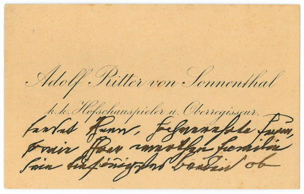 1 S. Visitkartenformat. Mit einigen Beilagen (s. u.). Wohl an die namentlich nicht genannte Witwe des Bassisten Wilhelm Hesch, der am 4. Januar verstorbenen war: Adolf Ritter von Sonnenthal (dies gedruckt) "sendet Ihnen, hochverehrte Frau, sowie Ihrer werthen Familie sein aufrichtigstes Beileid ob des grausamen Schicksalsschlages, der Sie, der die ganze Künstlerwelt betroffen". - Der in Pest geborene Schauspieler wurde 24jährig 1856 von Heinrich Laube an das Wiener Hofburgtheater engagiert, "spielt den Mortimer und fällt durch. Laube läßt sich indes nicht beirren, gibt ihm einen dreijährigen Kontrakt, und ehe der abläuft, ist er zum k. k. Hofschauspieler ernannt [.] er wird zum meistbeschäftigten Mitglied des Burgtheaters: 160 Vorstellungen pro Saison. Heimlich verlobt mit der reichen Pauline Pappenheim, heiratet er sie erst, als die Familie verarmt, er aber schon konsolidiert ist [.] 1881 verleiht ihm Kaiser Franz Joseph die Eiserne Krone I. Klasse, die damals noch mit dem erblichen Adel verbunden ist. Arthur Schnitzler meint Sonnenthal, wenn er im ‚Grünen Kakadu' sagen läßt: ‚Einer, der uns vorspielen kann, was er will, ist doch mehr als wir alle'" (Haeusserman, Das Wiener Burgtheater, Wien u. a., Molden, 1975, S. 57). - Beiliegend ein 28zeiliges Gedicht eines Alfons Juritsch an die Witwe (1½ SS. auf Doppelblatt), ein e. Brief mit U. eines Dr. Heyrovsky (¾ S. auf Doppelblatt, mit irriger Datierung "1907") und eine Visitenkarte von Bürgermeister Karl Lueger mit einigen Zeilen von Schreiberhand (1 S.), alle zum selben Anlaß.